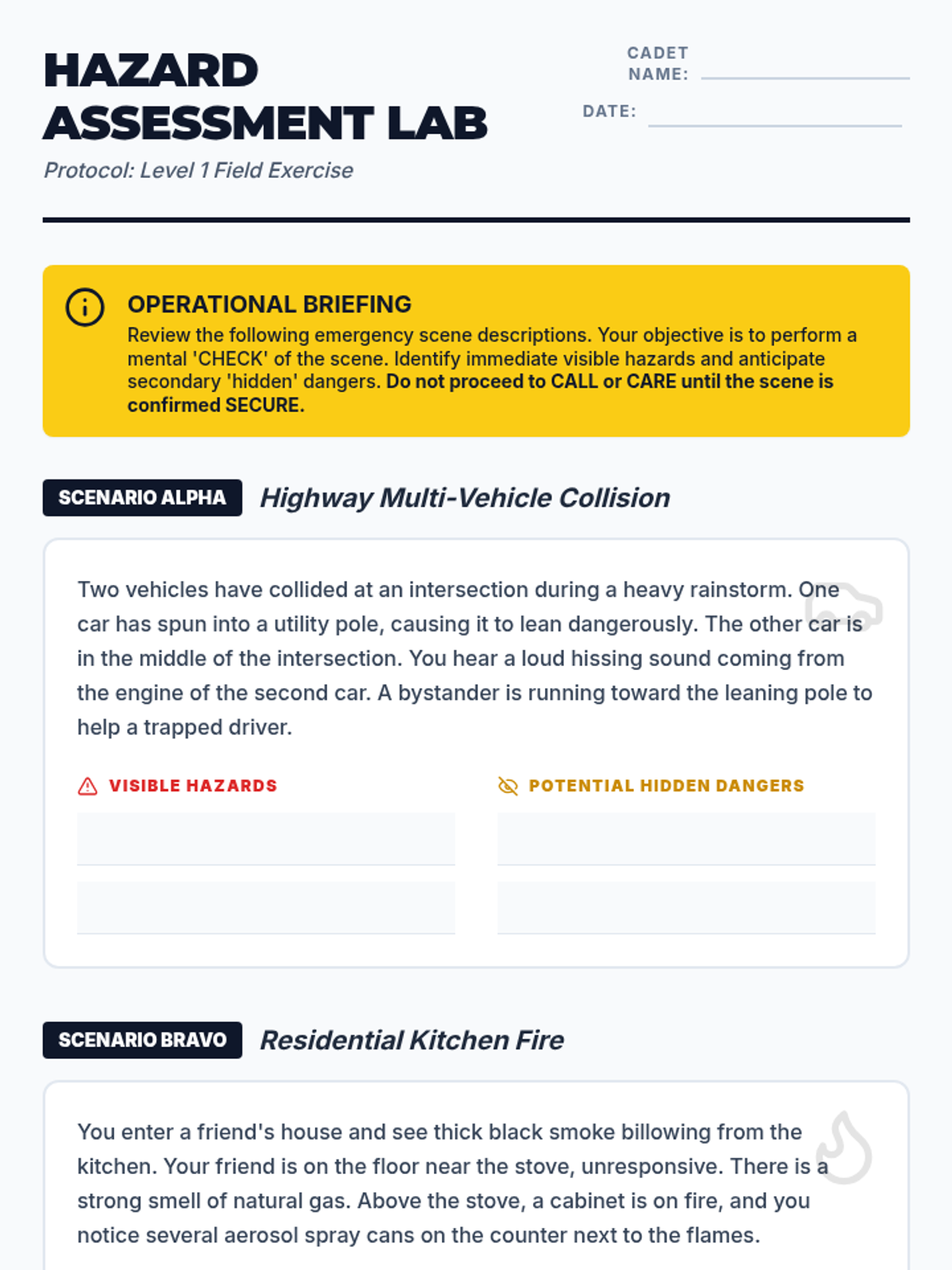 A comprehensive unit on emergency scene management, focusing on the cognitive and communicative skills required to navigate high-stress crises. Students learn hazard recognition, dispatch protocols, fire evacuation, and triage prioritization.