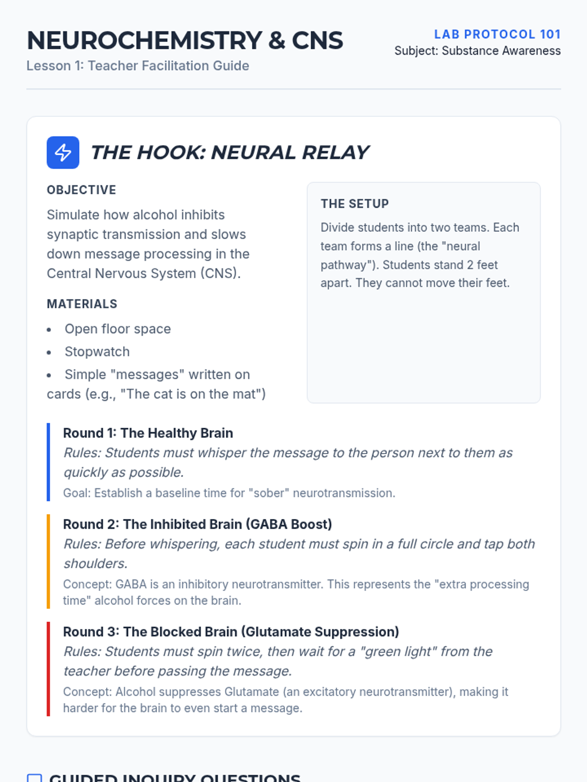 A comprehensive 10th-grade health unit exploring the neurochemical and physiological impacts of alcohol. Students investigate how alcohol affects neurotransmitters, leads to acute poisoning, causes chronic organ damage, and alters the developing adolescent brain.