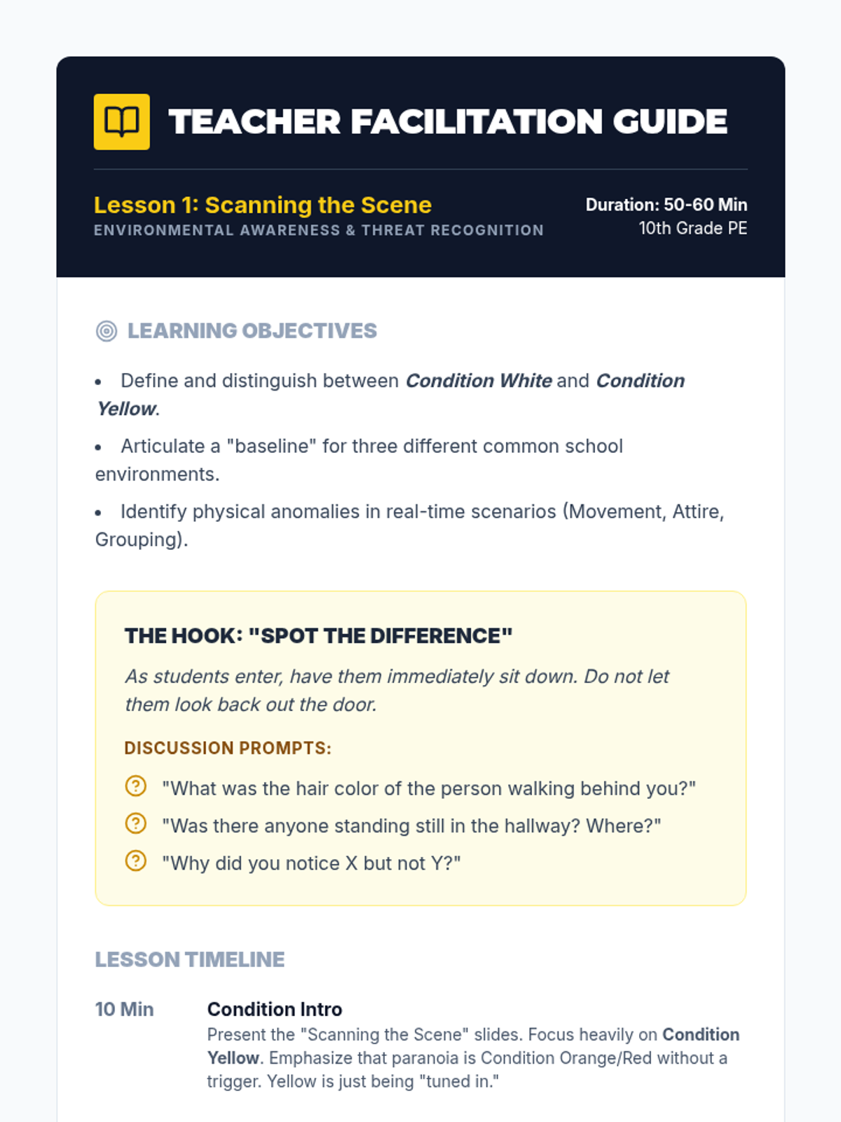 A comprehensive physical education sequence for 10th grade students focusing on the mental and strategic aspects of self-defense. This unit prioritizes situational awareness, verbal de-escalation, boundary setting, and the legal/physiological components of personal safety over physical combat.