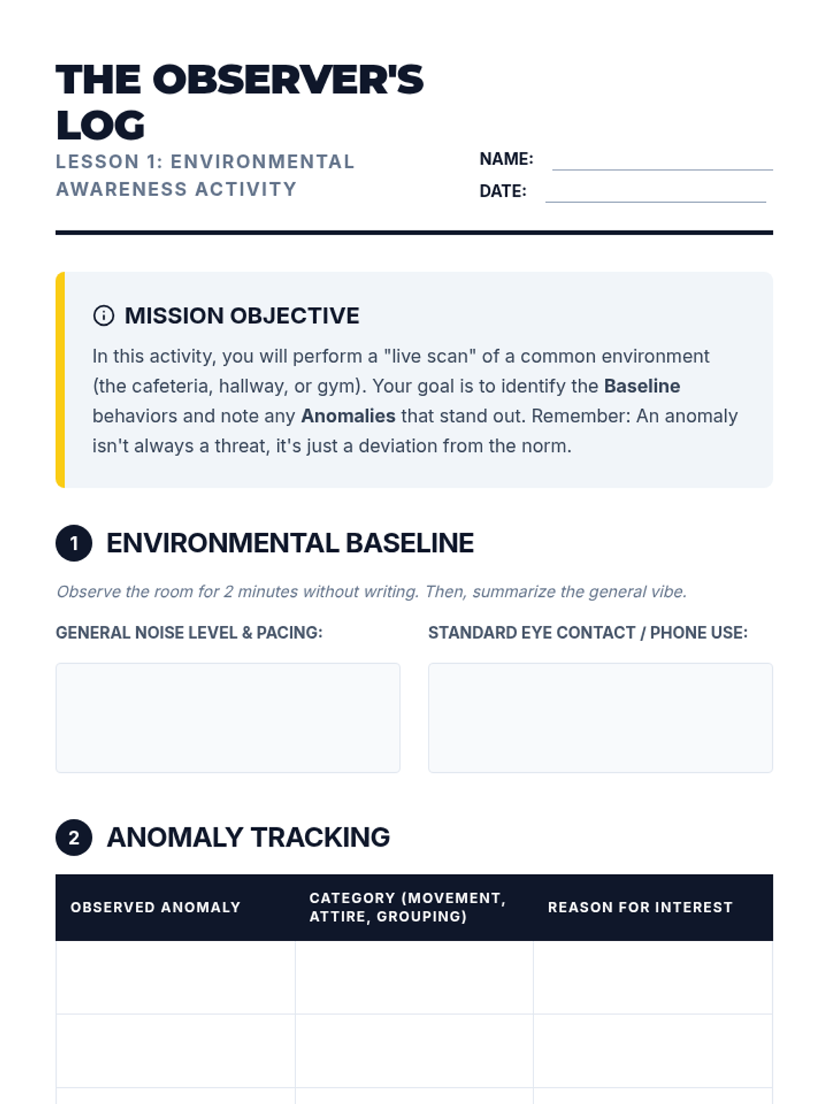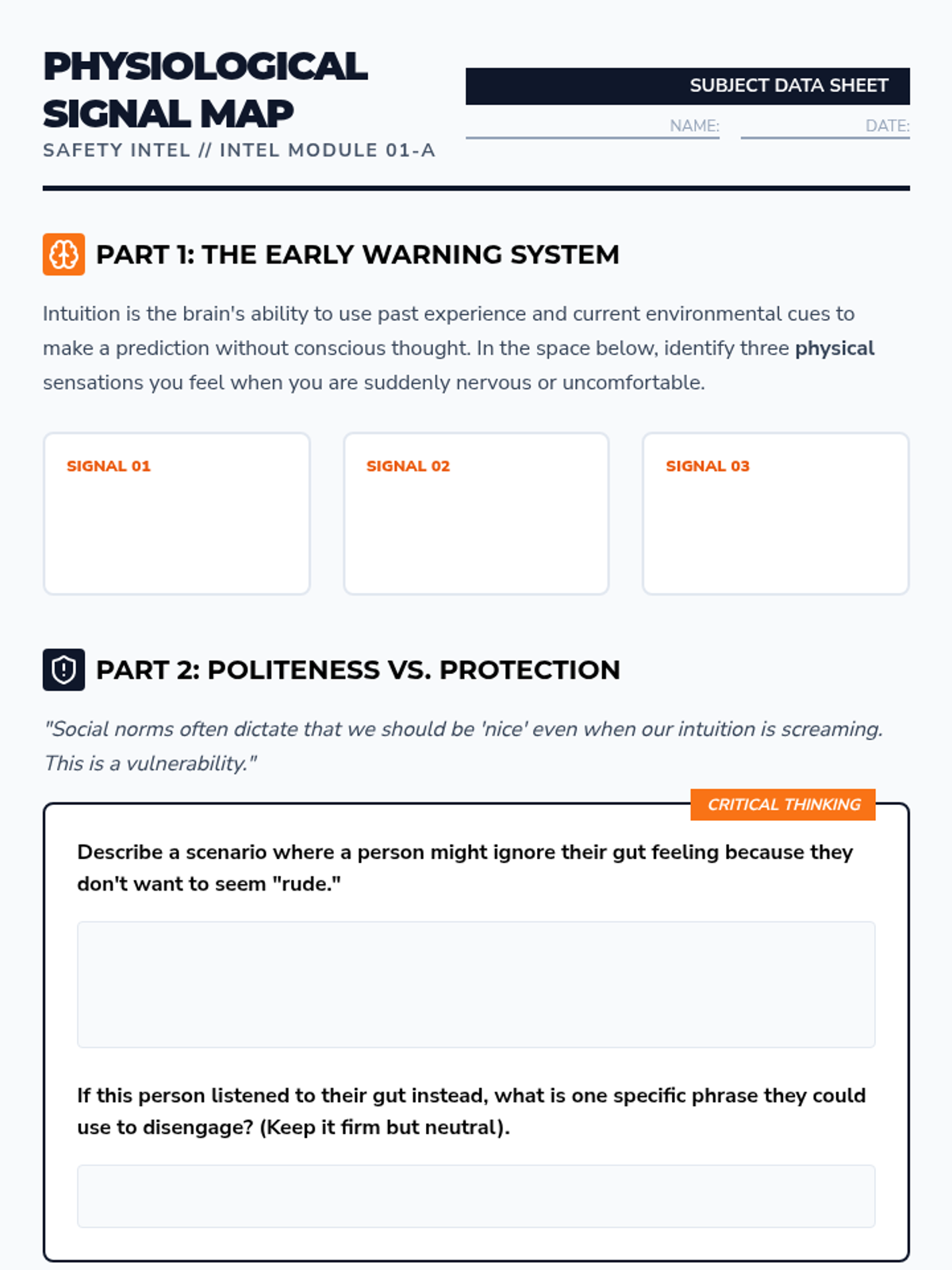 Recognizing Unsafe SituationsIdentifies physical and social cues that signal danger in various environments. Strengthens situational awareness and boundary-setting skills to help students navigate potential risks safely.