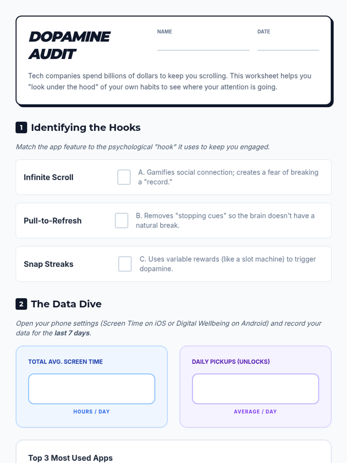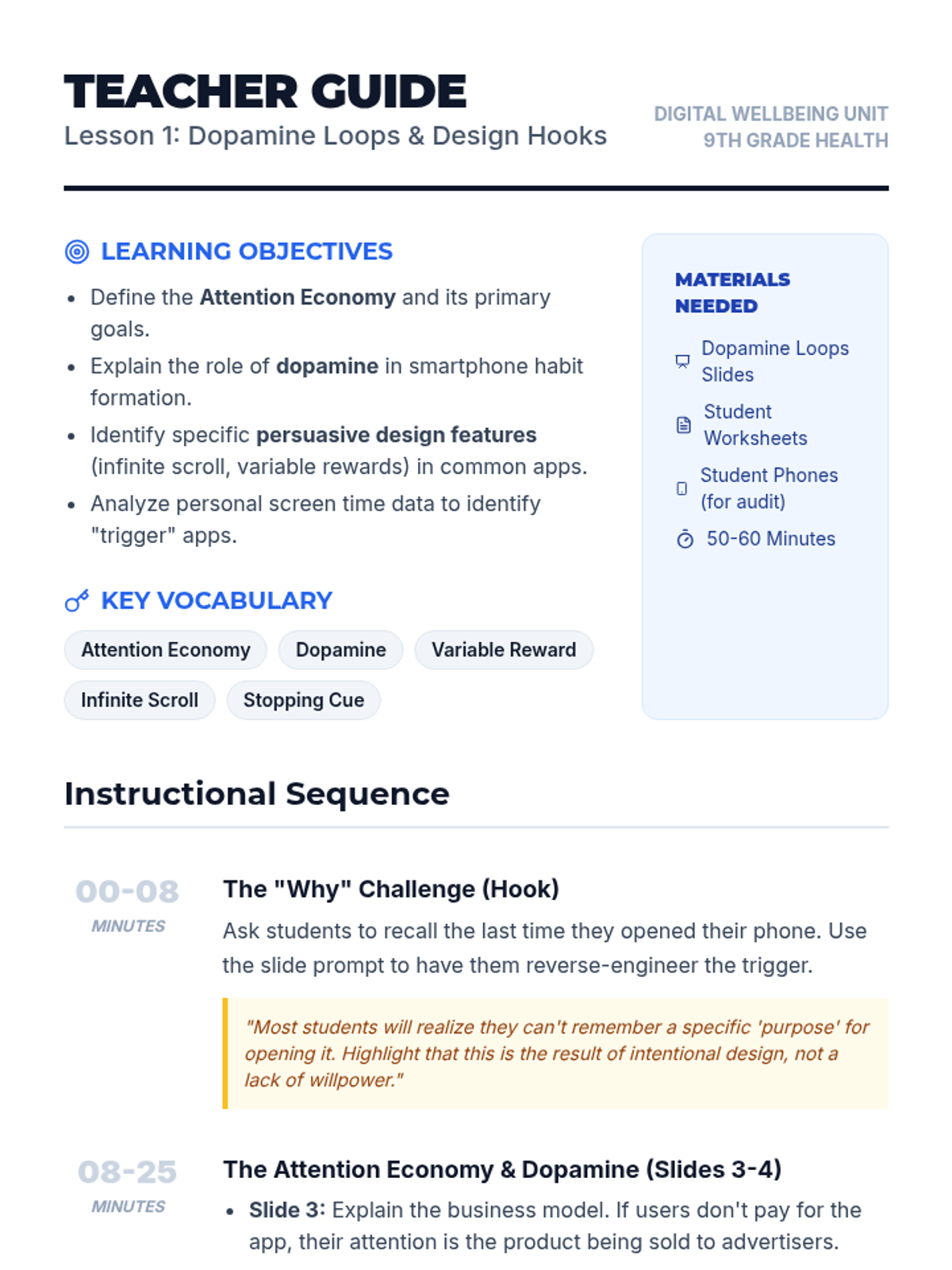 A comprehensive 9th-grade health sequence exploring the psychological impact of digital technology, the mechanics of the attention economy, and strategies for maintaining mental wellbeing in a connected world. Students will analyze social media design, the 'curated self', cyberbullying, and physical health impacts to develop a personalized digital wellness plan.