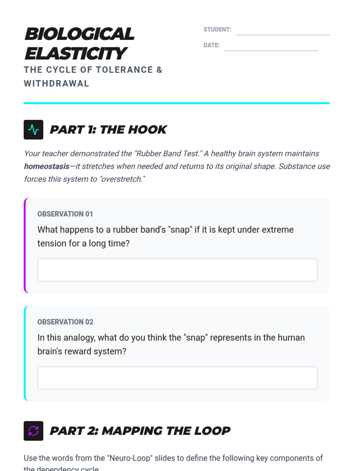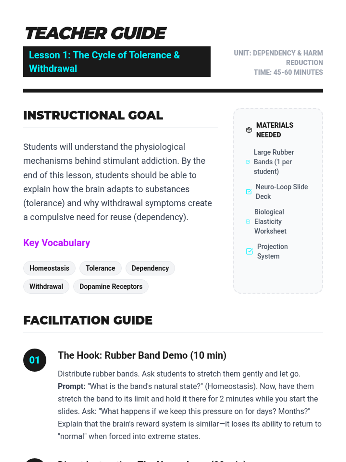 A comprehensive 5-lesson sequence for 10th-grade students focusing on the physiological cycle of stimulant addiction, identifying signs of dependency, emergency response protocols for harm reduction, and community advocacy. Students move from understanding the biology of addiction to creating resources for their peers.