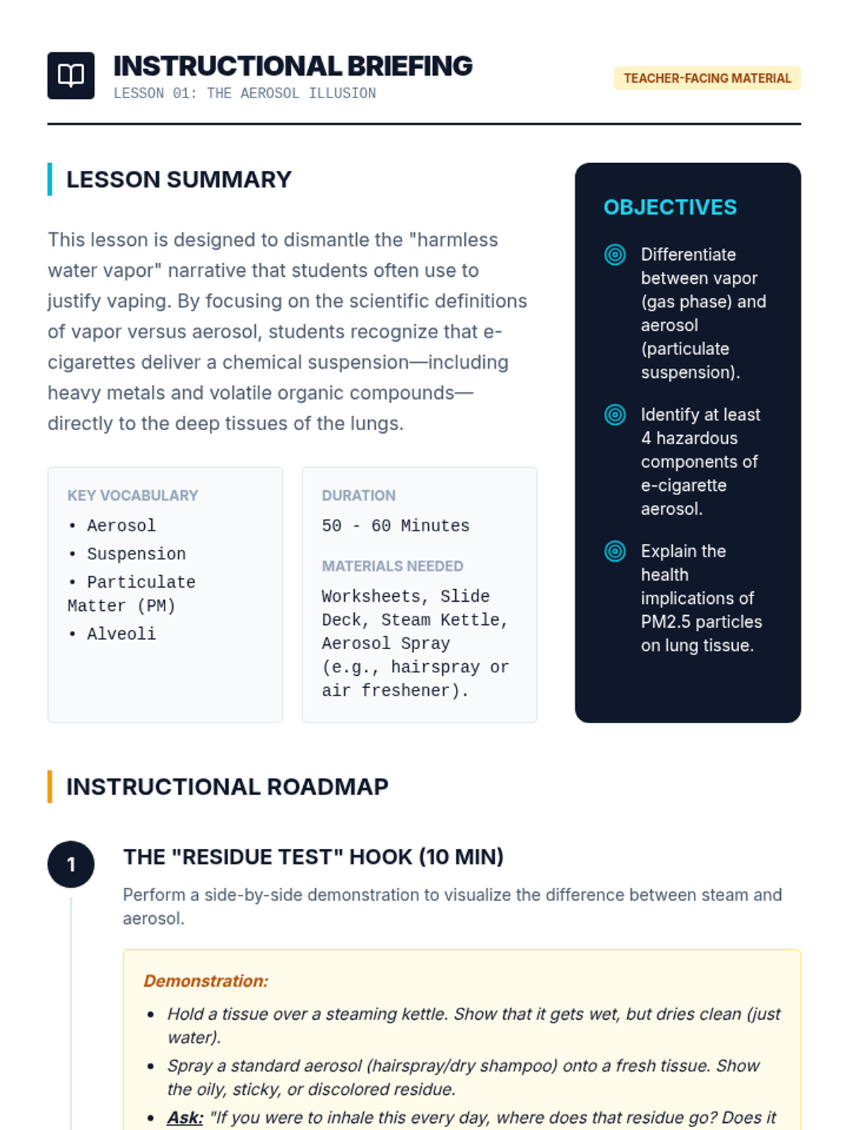 A comprehensive 8th-grade health sequence focused on the scientific realities and hidden dangers of vaping. Students explore the technical mechanics of e-cigarettes, medical consequences like EVALI, chemical concentrations of nicotine salts, and hardware safety risks to debunk common myths.