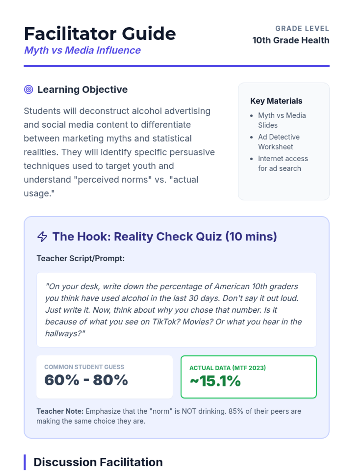 A comprehensive 5-lesson sequence for 10th graders focusing on alcohol awareness, refusal skills, and bystander intervention. Students will analyze media influence, practice assertive communication, navigate complex social scenarios, and develop personal safety plans.