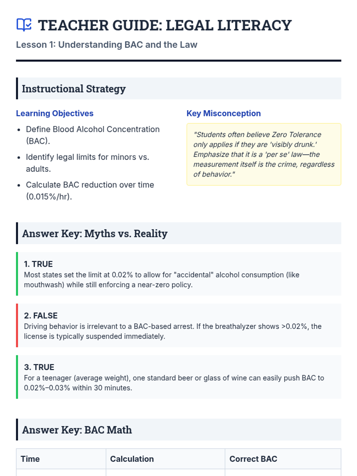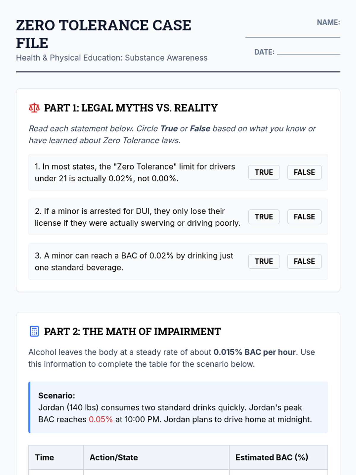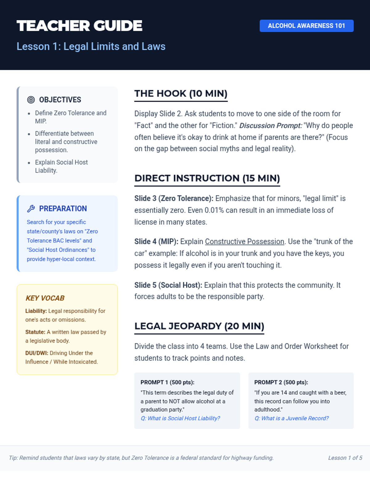 A comprehensive sequence for 7th-grade students focused on the legal ramifications and physical safety risks of alcohol consumption. It covers underage laws, the physics of impaired driving, medical emergencies (alcohol poisoning), and long-term consequences of a legal record.
