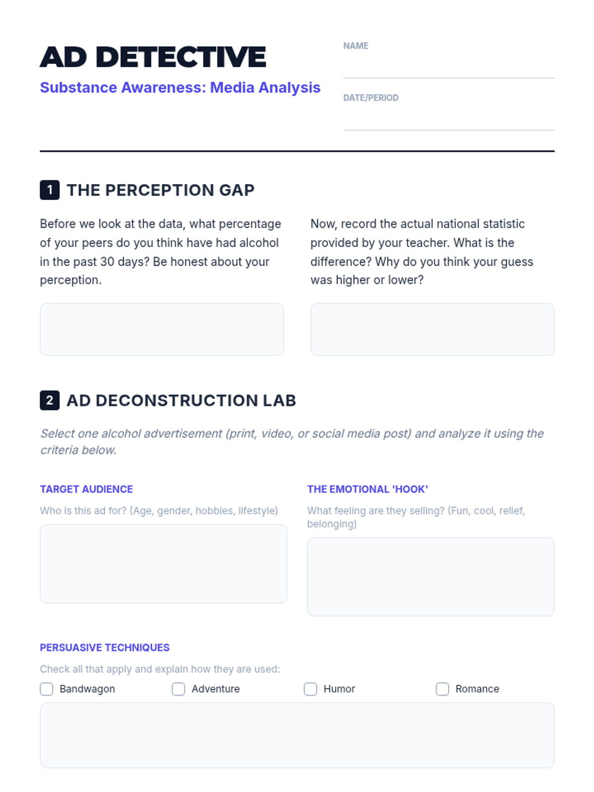 This sequence explores how social media distortions fuel peer pressure regarding substance use. Students will develop media literacy skills to decode influencer culture, analyze digital footprints, and create their own advocacy content to empower their peers.