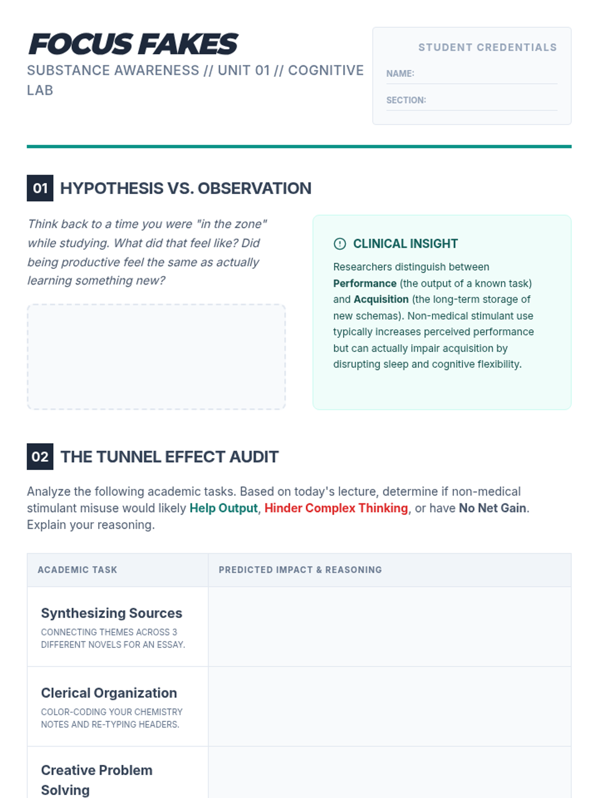 This sequence explores the misuse of prescription stimulants as 'study drugs' in high-pressure academic environments. Students will debunk cognitive myths, analyze the legal and ethical consequences of drug diversion, map the physiological burnout cycle, and master natural executive function strategies to achieve authentic success.