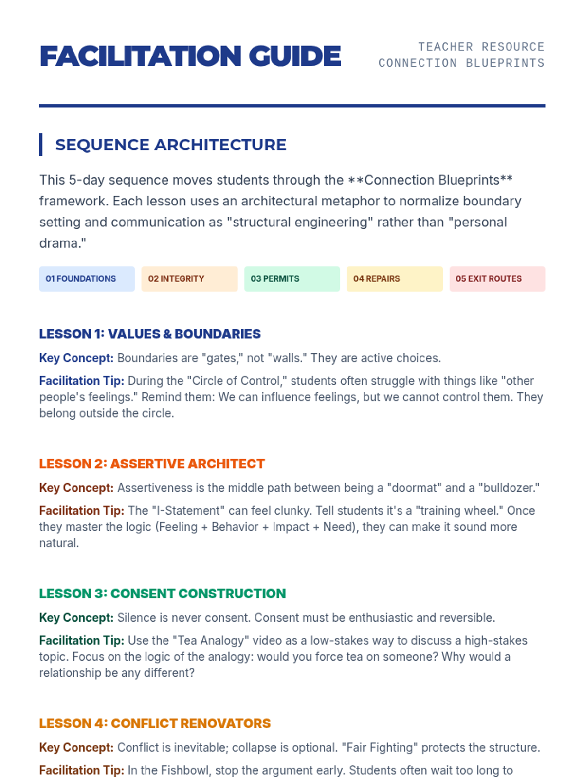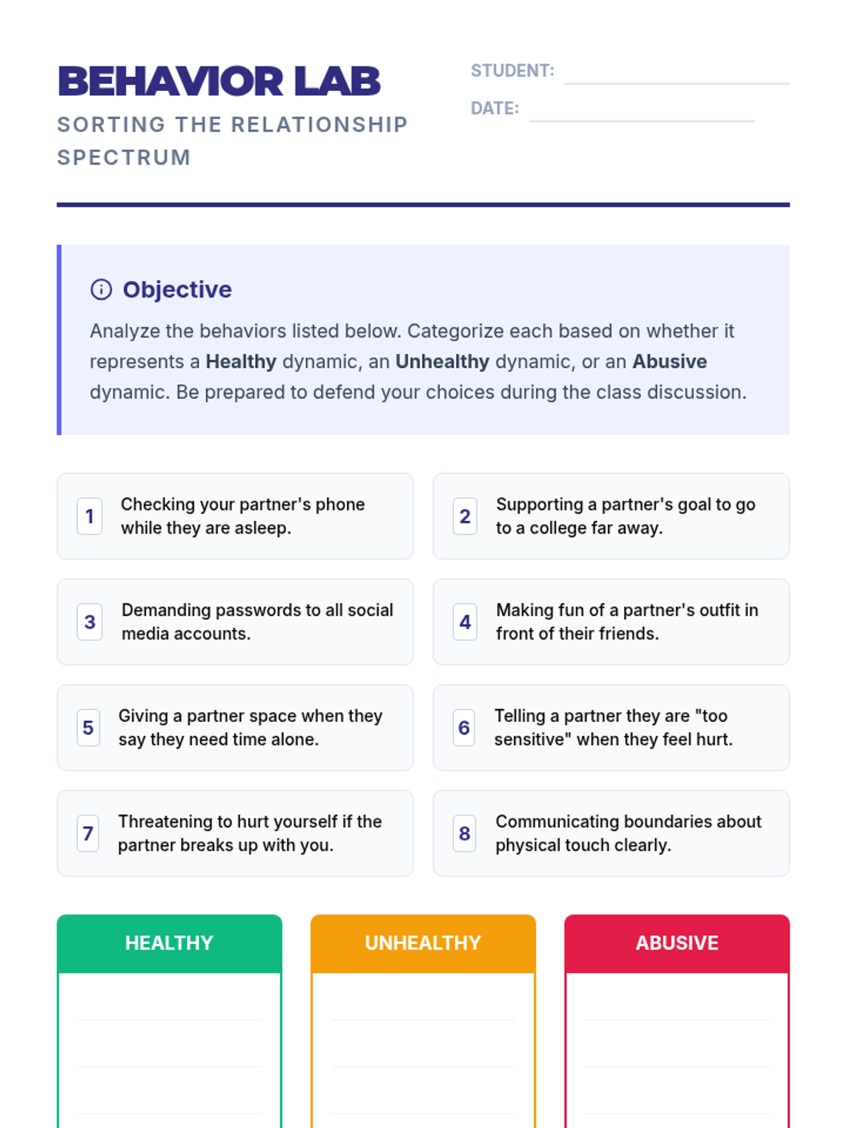 A comprehensive 5-lesson unit for 10th-grade students exploring the nuances of healthy relationships, power dynamics, consent frameworks (FRIES), digital boundaries, and real-world case study analysis. Students move from basic definitions to complex ethical evaluations and safety planning.