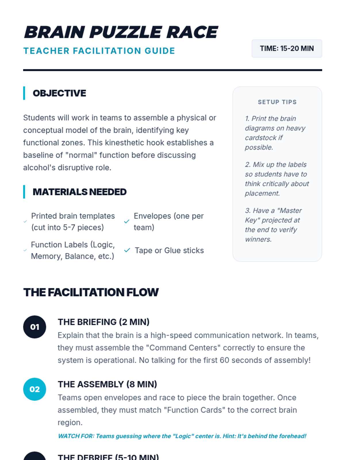 This sequence explores the biological and neurological impacts of alcohol on the developing adolescent brain. Students investigate brain structures, neurotransmitter disruption, motor impairment, and the science of addiction through simulations and inquiry-based activities.