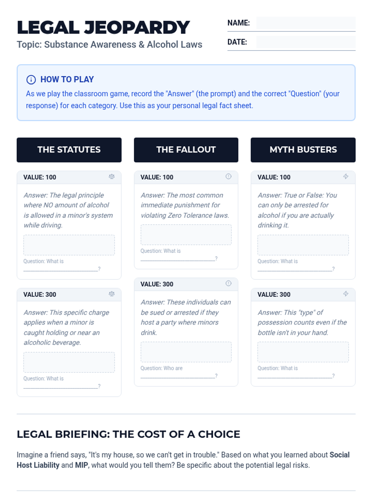 This sequence examines the serious legal and safety ramifications of underage drinking and driving under the influence. Through case studies and legal analysis, students explore how one decision can have cascading effects on their future, their families, and the community.