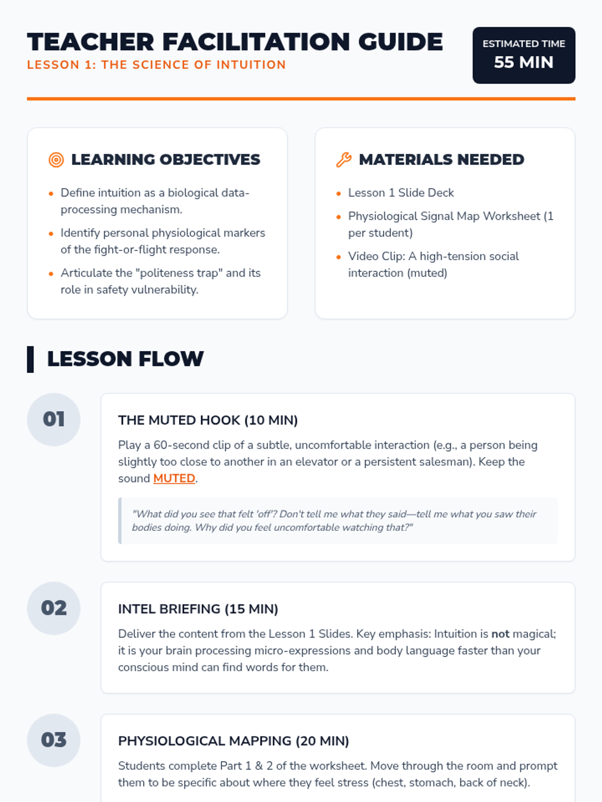 A comprehensive self-defense sequence for high school students focusing on situational awareness, verbal de-escalation, and fundamental stand-up defensive tactics centered on the 'Stun and Run' philosophy.