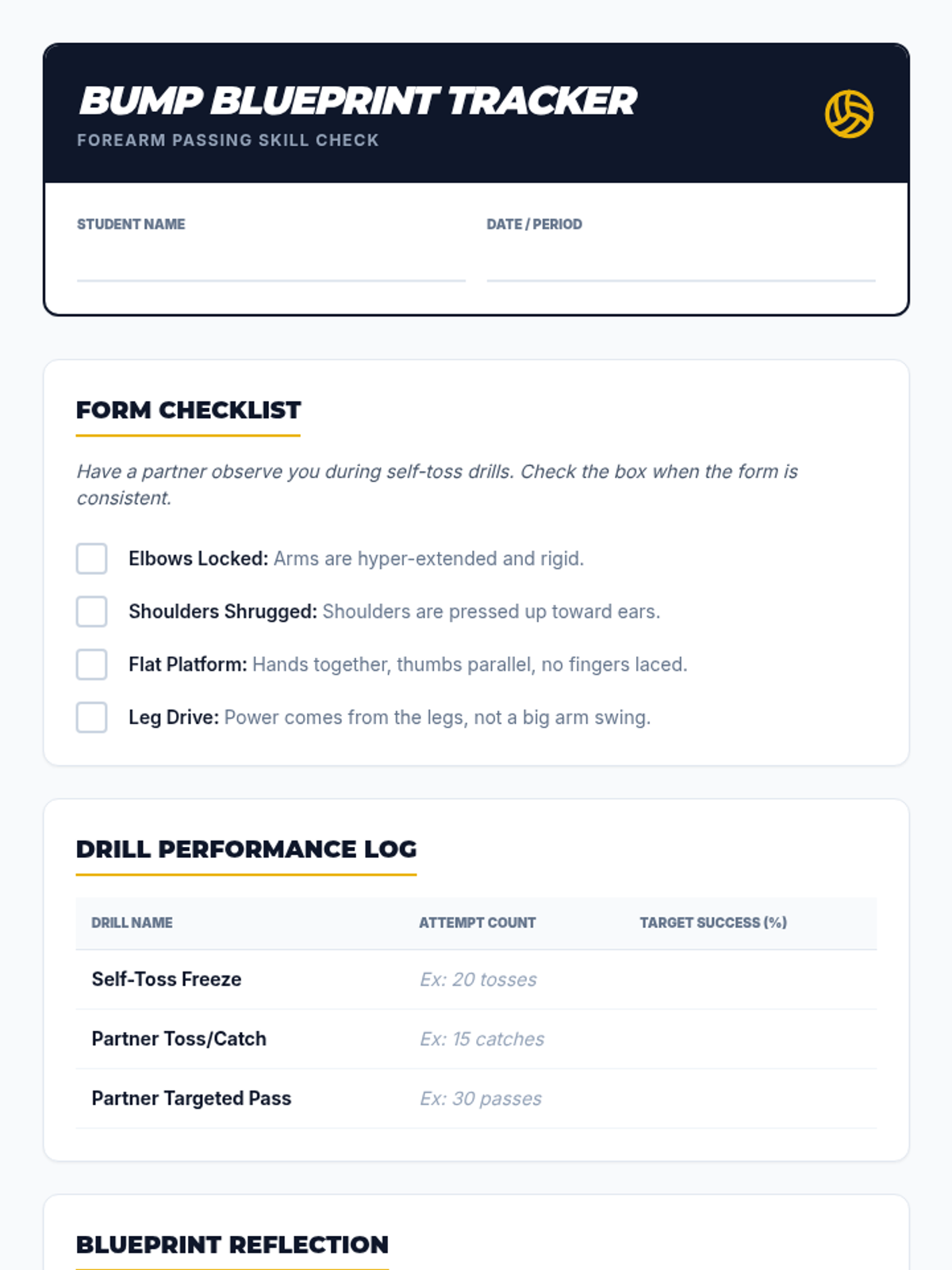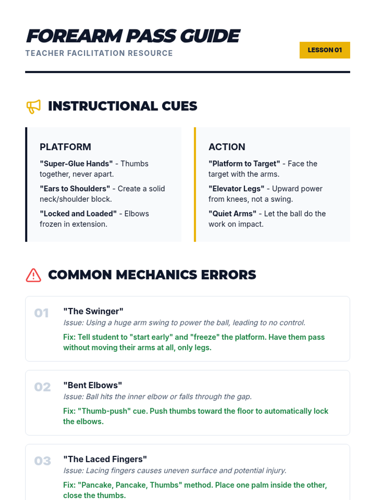 This sequence focuses on refining the biomechanics of the forearm pass (bump) and the overhead pass (set) for 10th-grade students. It moves from static form analysis to dynamic movement, emphasizing platform stability, angle creation, and footwork efficiency for high-repetition accuracy.