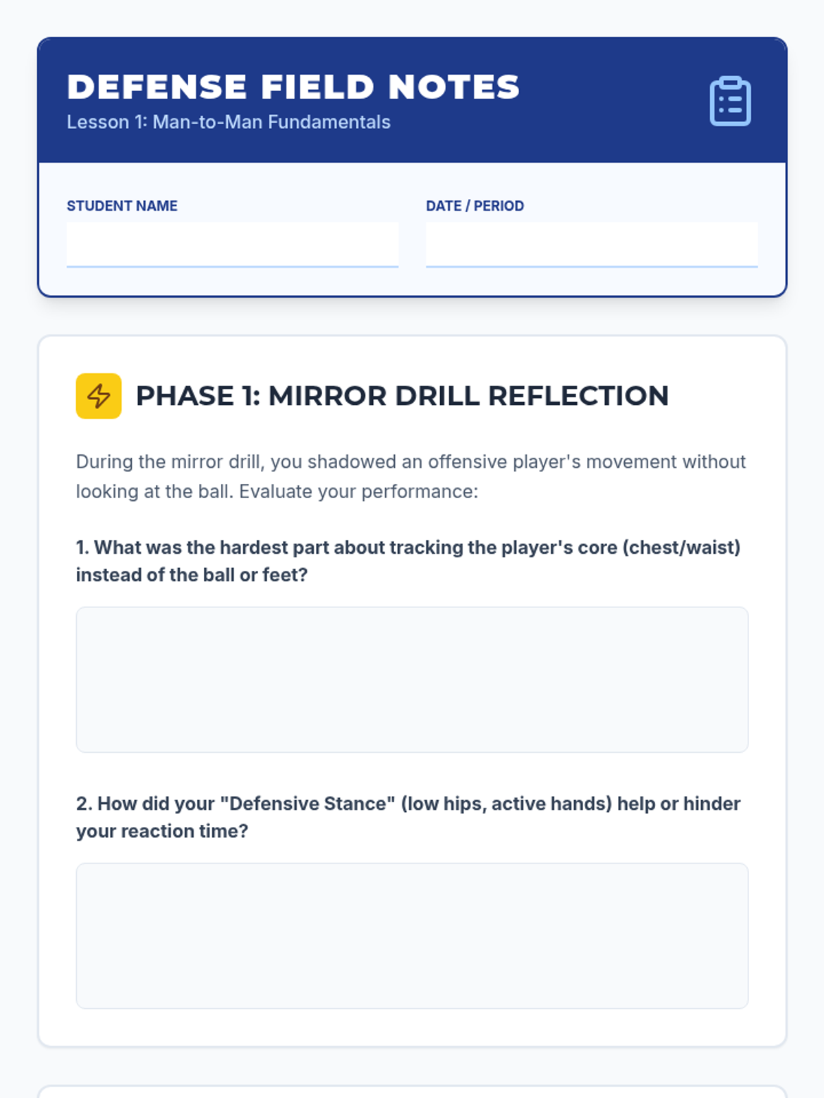 This 10th Grade PE sequence focuses on defensive organization, exploring the differences between man-to-man and zone systems. Students develop communication hierarchies, learn complex rotations, and analyze opponent tendencies to implement effective defensive strategies in real-time.