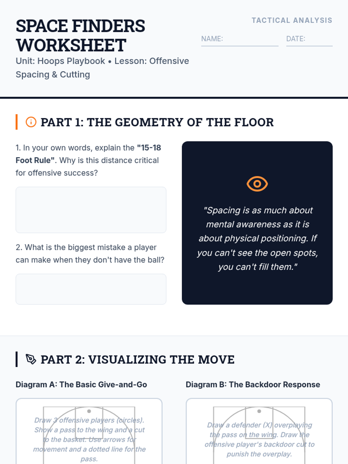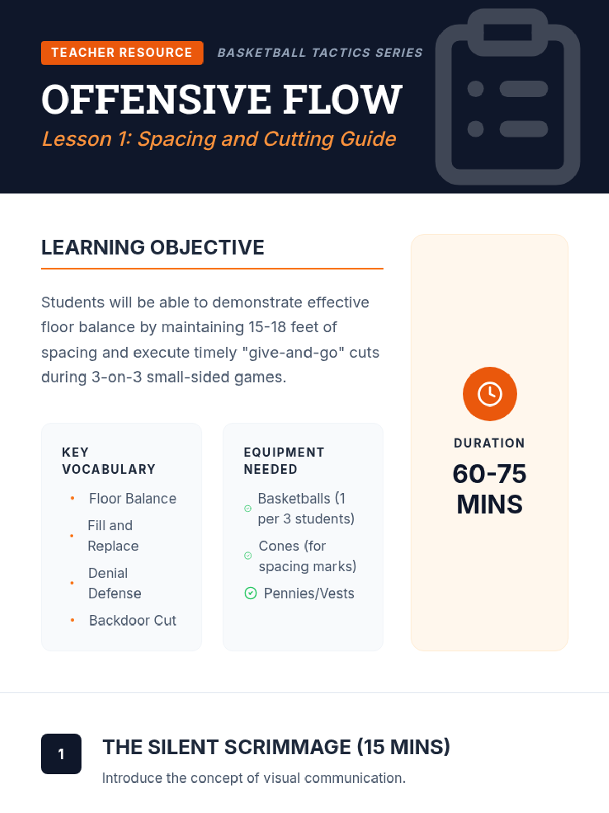 A comprehensive sequence for 10th Grade PE focused on the tactical side of basketball. Students move beyond basic skills to master court spacing, pick-and-roll mechanics, defensive rotations, zone schemes, and transition play through game-based simulations and strategic analysis.