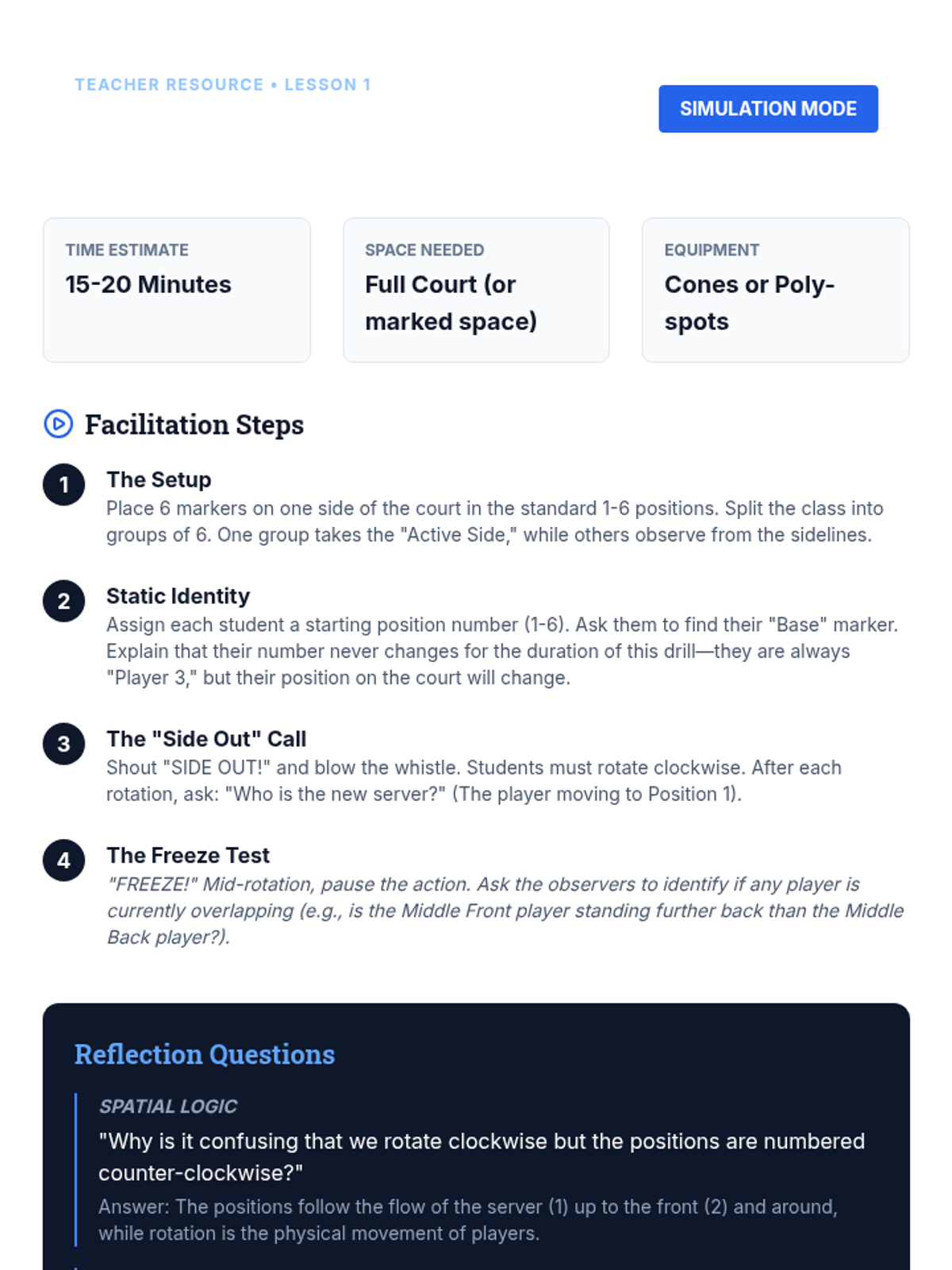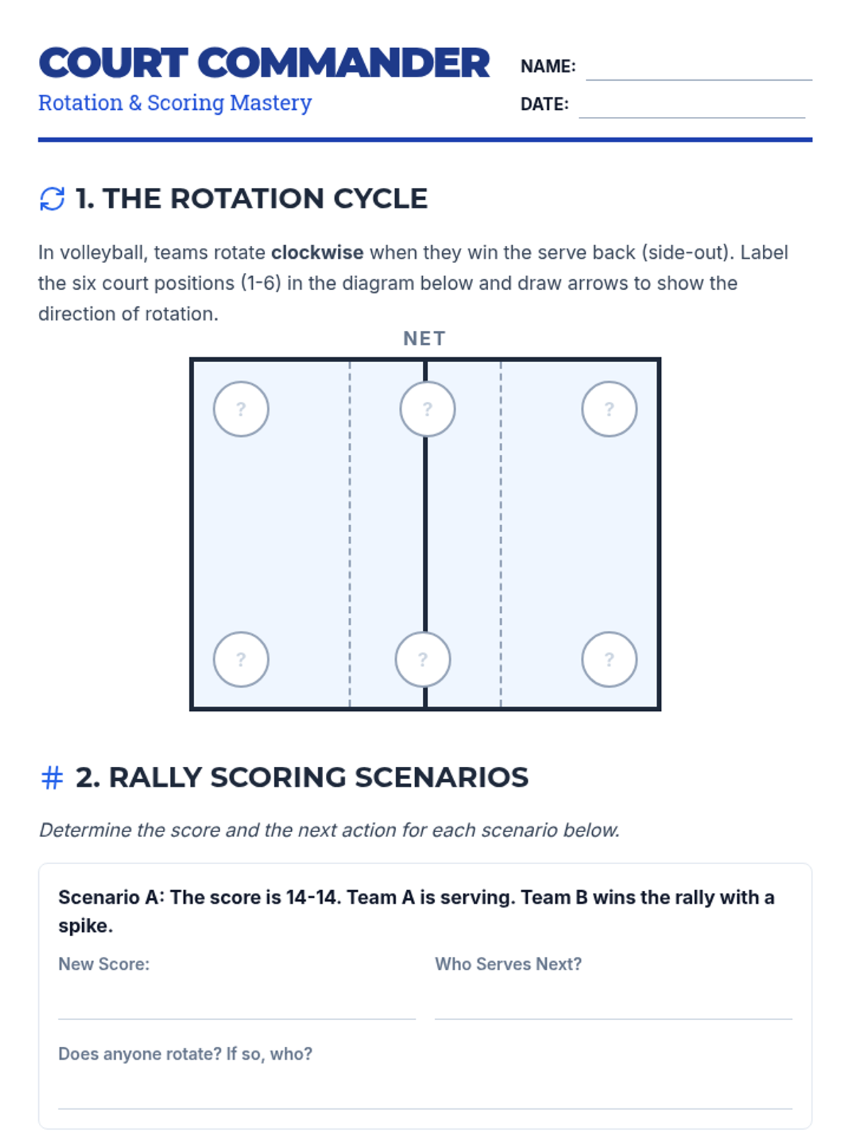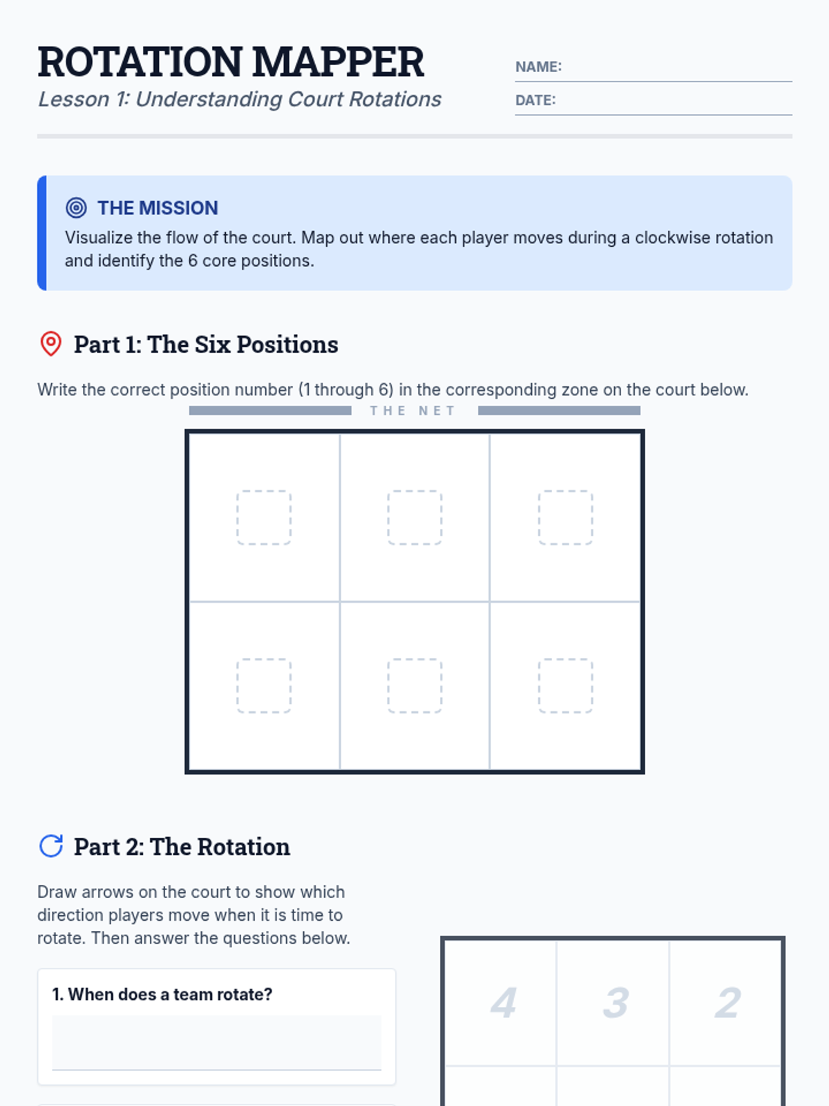 This sequence explores volleyball court rotations, serve receive formations, and defensive systems. Students will move from individual skills to team dynamics, learning how to maintain court balance, avoid overlap violations, and transition between offensive and defensive mindsets.