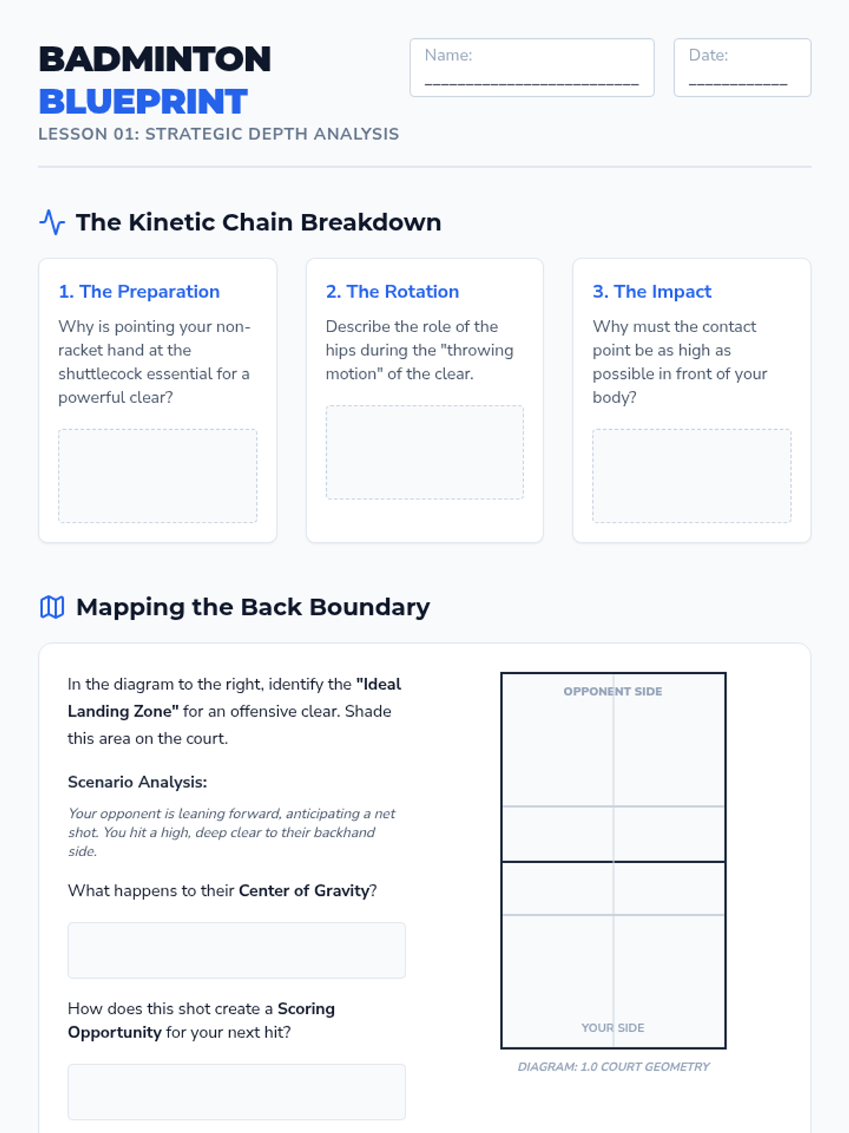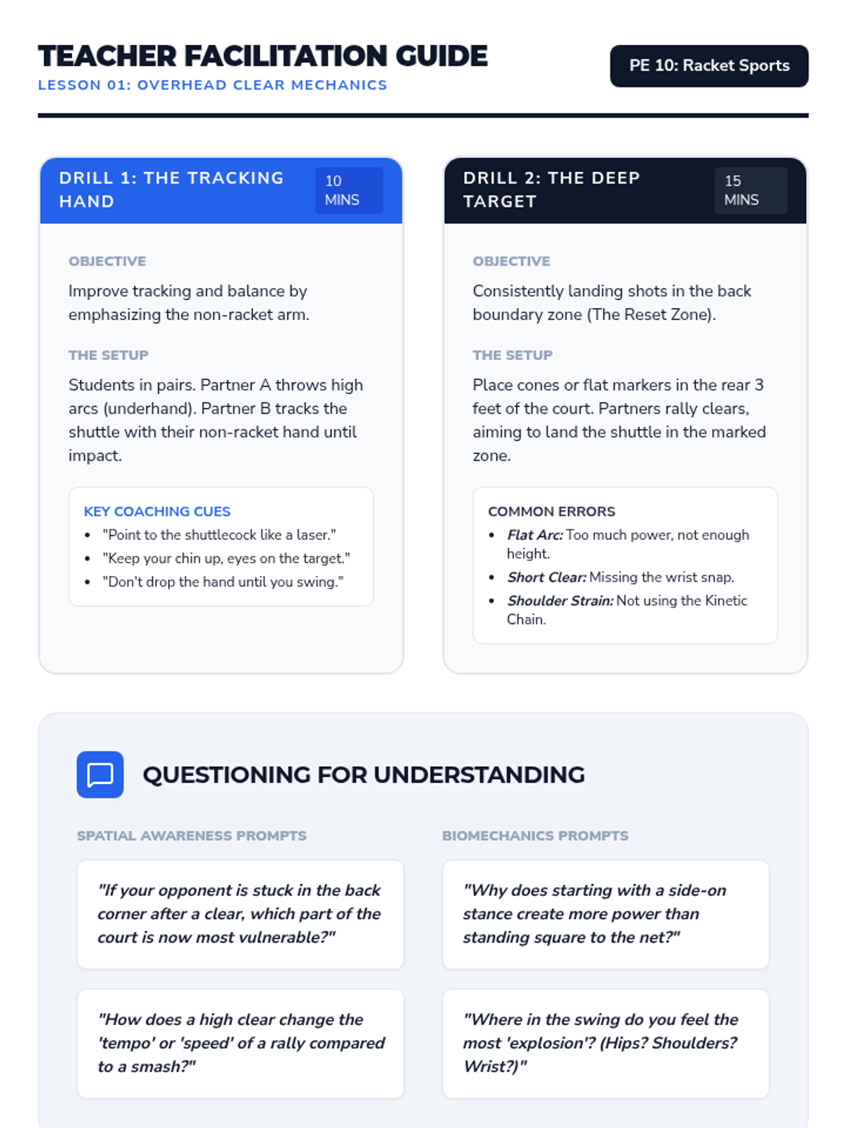 A comprehensive 10th-grade physical education unit focusing on badminton offensive tactics, spatial manipulation, and doubles rotation systems. Students analyze court geometry and biomechanics to master clears, drops, and smashes while learning to officiate and manage tournaments.