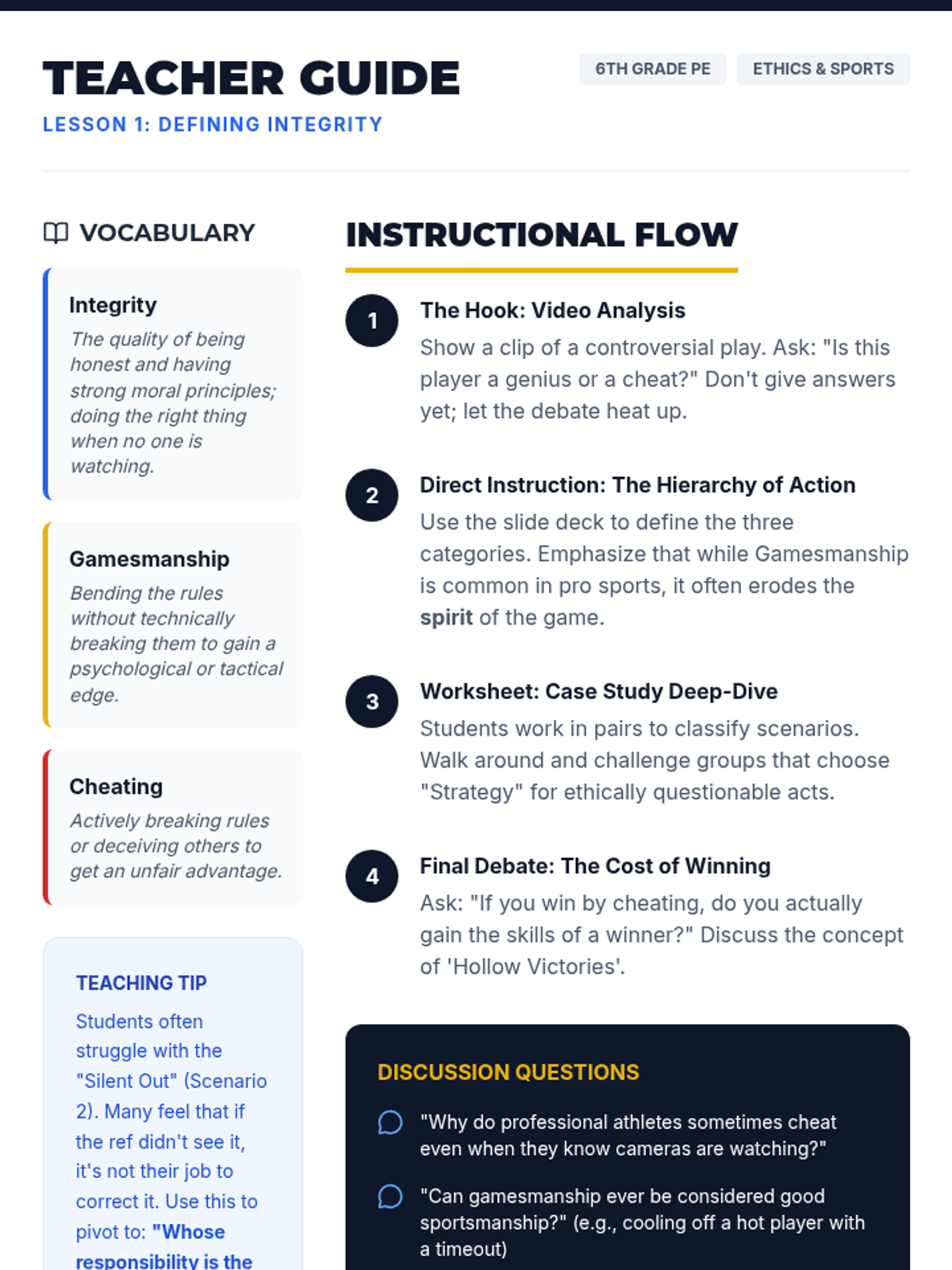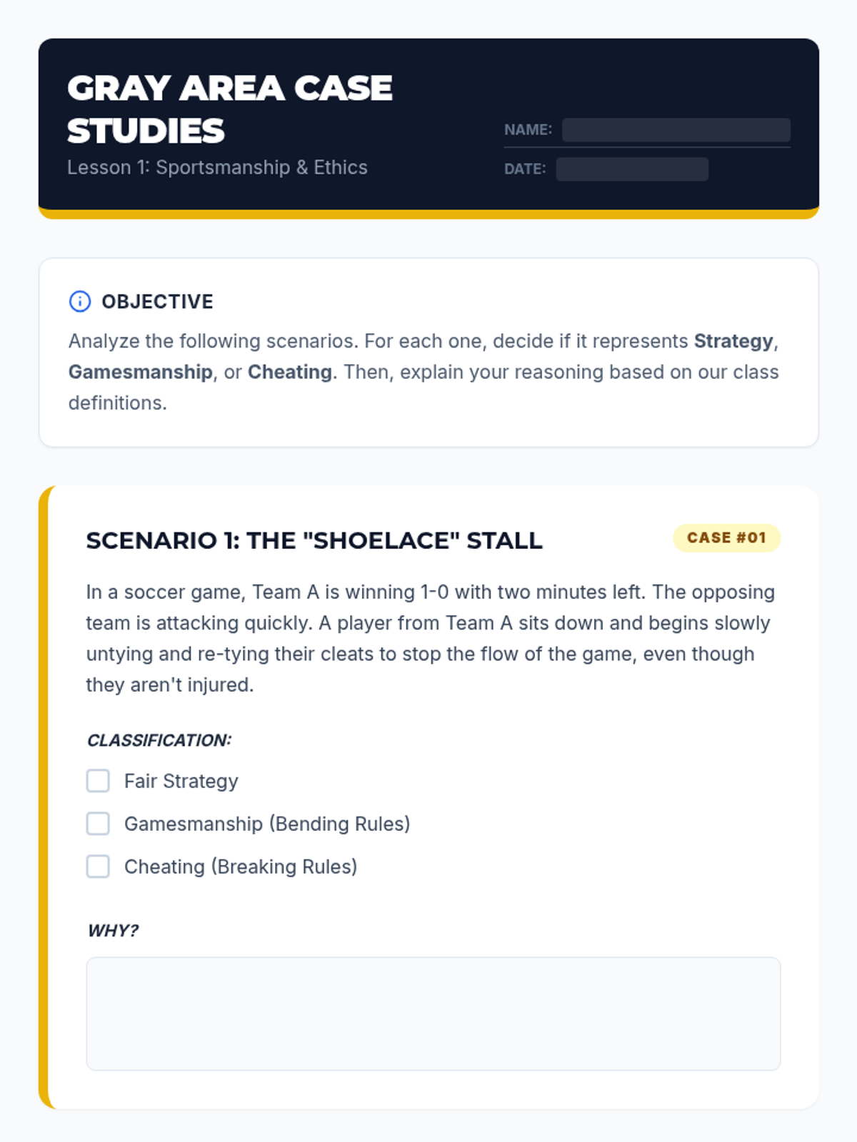 This sequence explores sportsmanship through case studies, simulations, and personal reflection. Students analyze the ethics of competition, experience the pressure of officiating, and commit to a shared code of conduct for fair play.