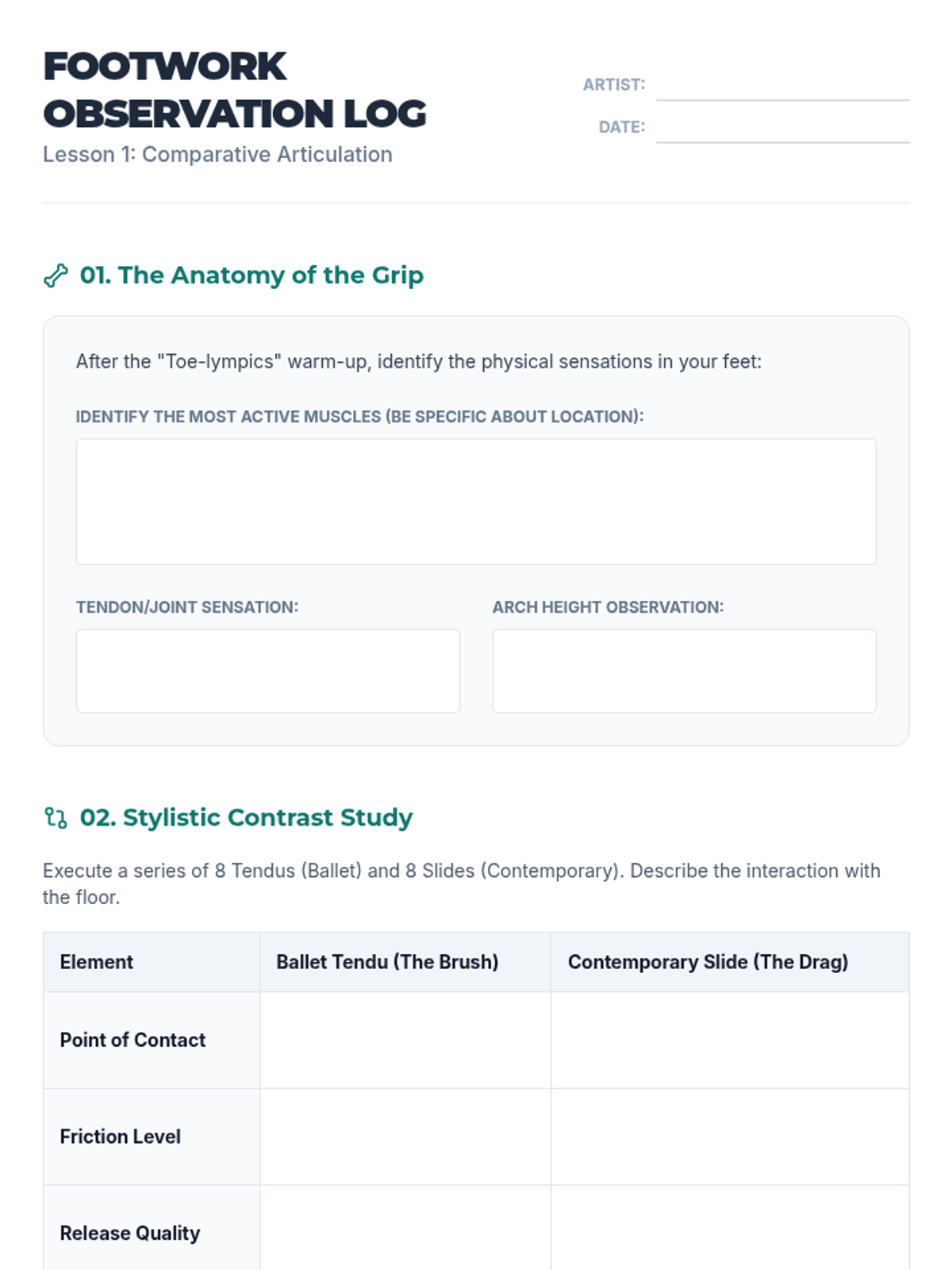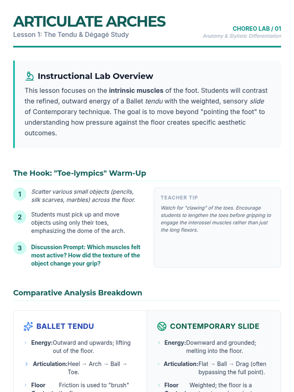 A comprehensive 11th-grade dance unit exploring the technical nuances of footwork across Ballet, Jazz, and Contemporary styles, focusing on articulation, percussion, grounding, and stylistic fusion.