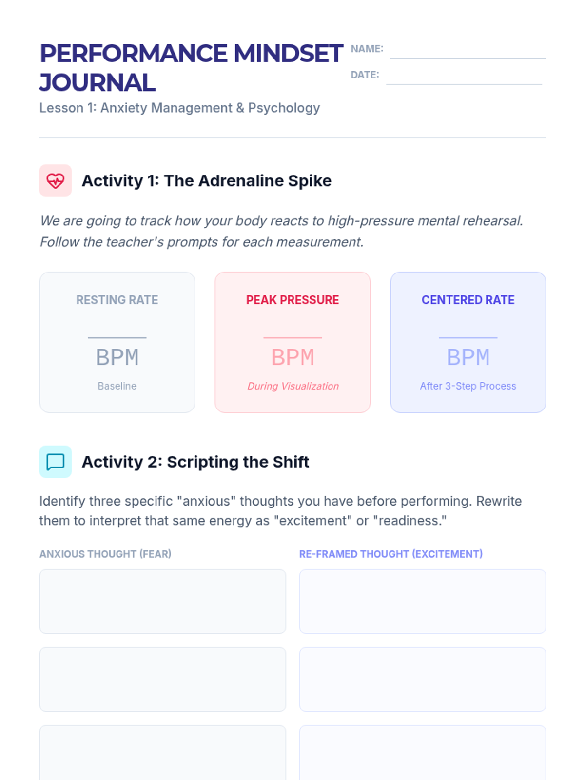 A comprehensive sequence for 11th-grade instrumentalists to master the technical, logistical, and psychological demands of solo performance and auditions. Students move from repertoire selection and deliberate practice planning to stage etiquette and peer-reviewed mock auditions, culminating in a polished final performance.