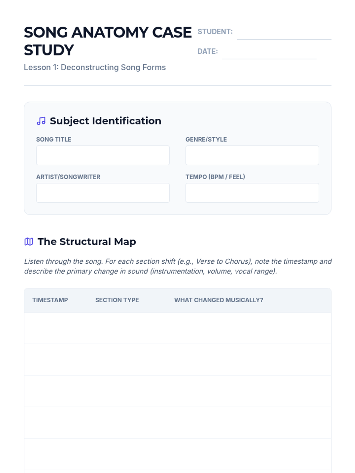 This sequence explores the architectural side of songwriting, focusing on how contemporary song structures (verse, chorus, bridge) and lyrical techniques work together to create emotional impact. Students will analyze existing blueprints, draft their own imagery-rich lyrics, and master the art of prosody to ensure their music and words flow perfectly together.