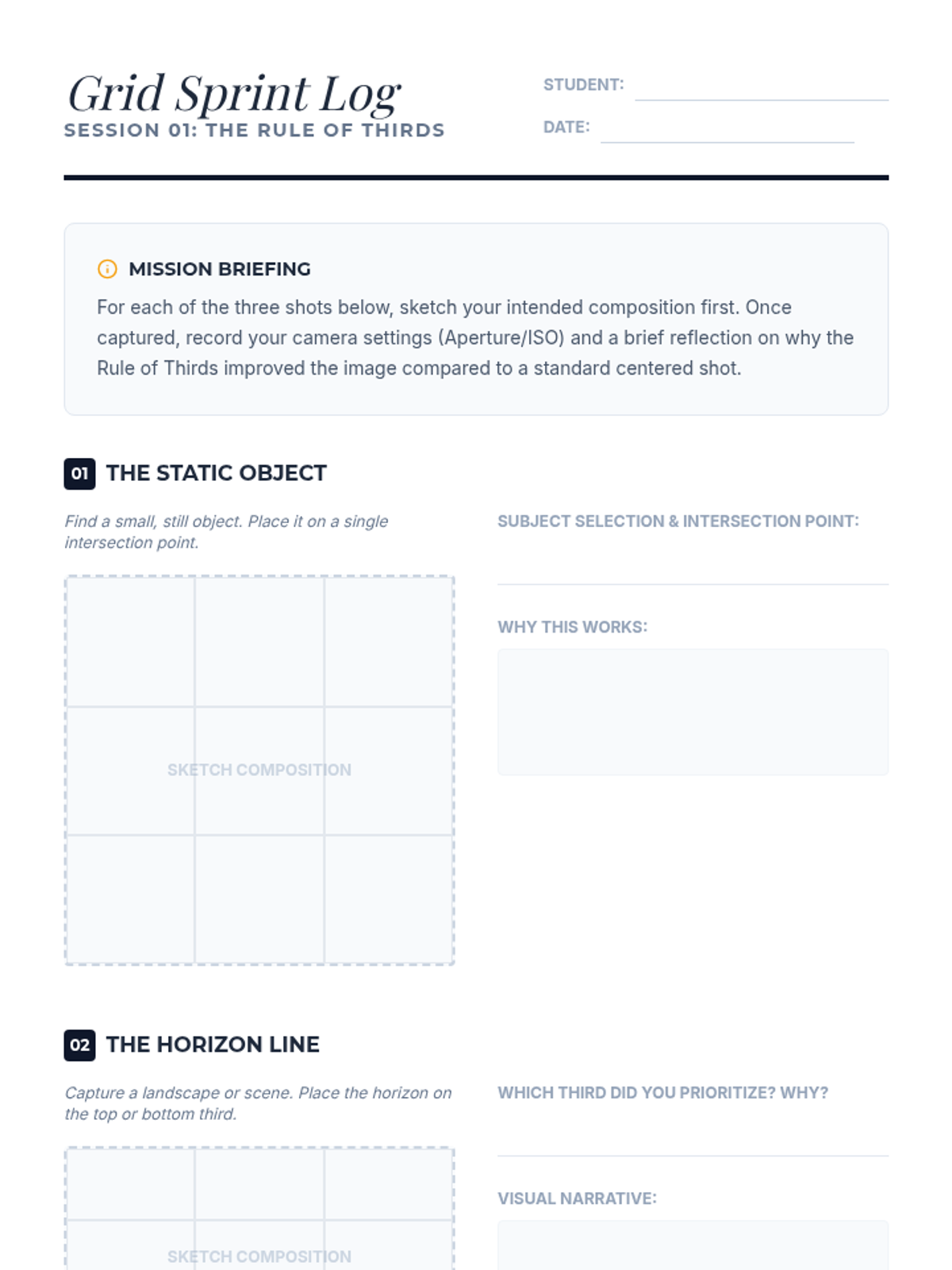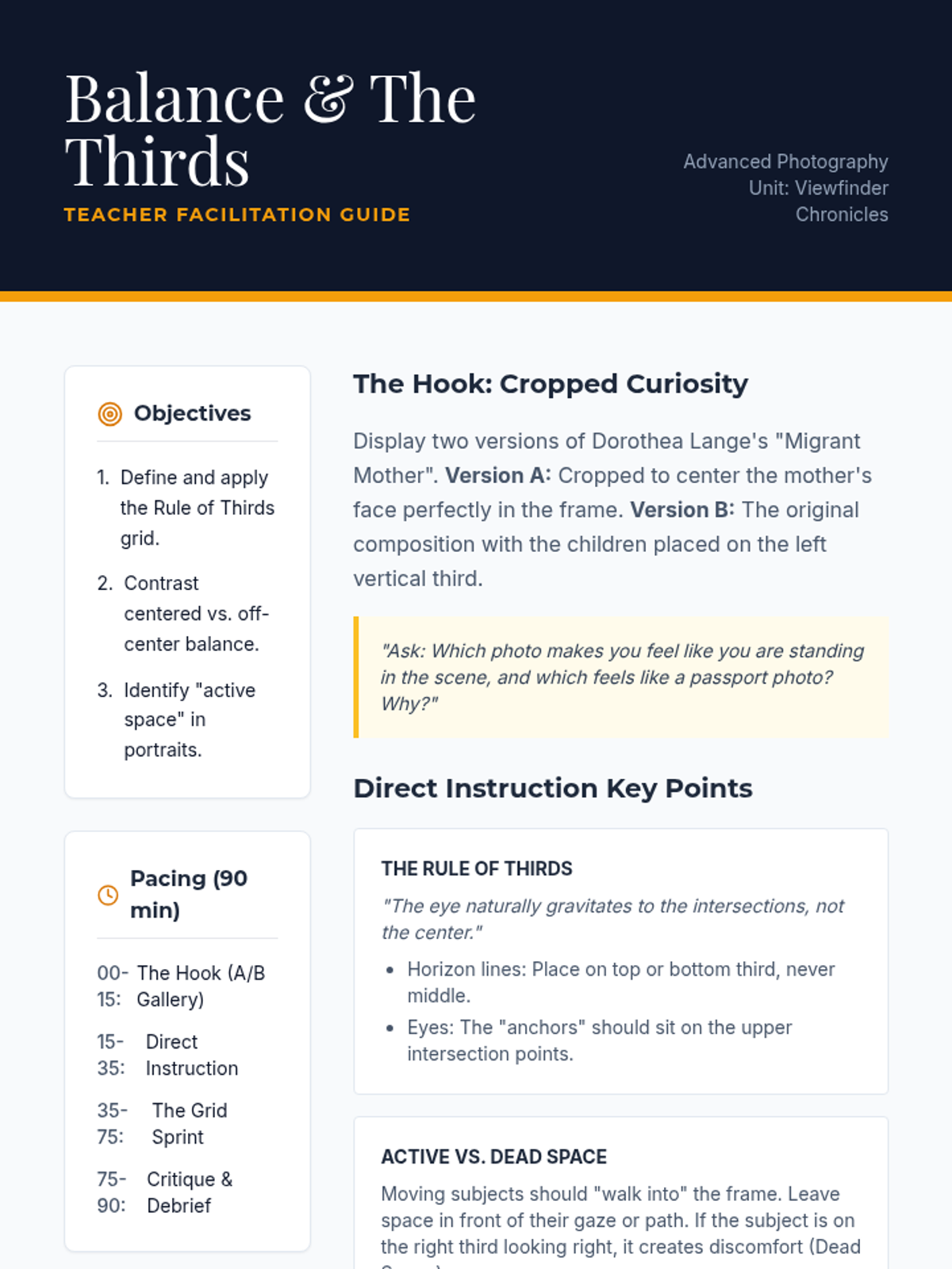 A comprehensive 11th-grade photography sequence focusing on advanced composition, guiding students from foundational rules to intentional creative disruption. Students will explore the Rule of Thirds, leading lines, negative space, and pattern, culminating in a sophisticated portfolio project.
