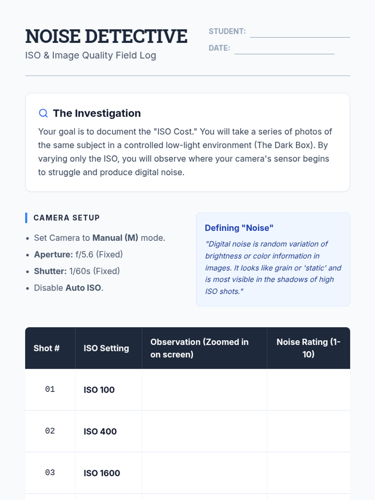 A comprehensive 9th-grade photography sequence that demystifies the Exposure Triangle: Aperture, Shutter Speed, and ISO. Students progress from diagnosing exposure errors to mastering manual control through hands-on experiments and artistic challenges.