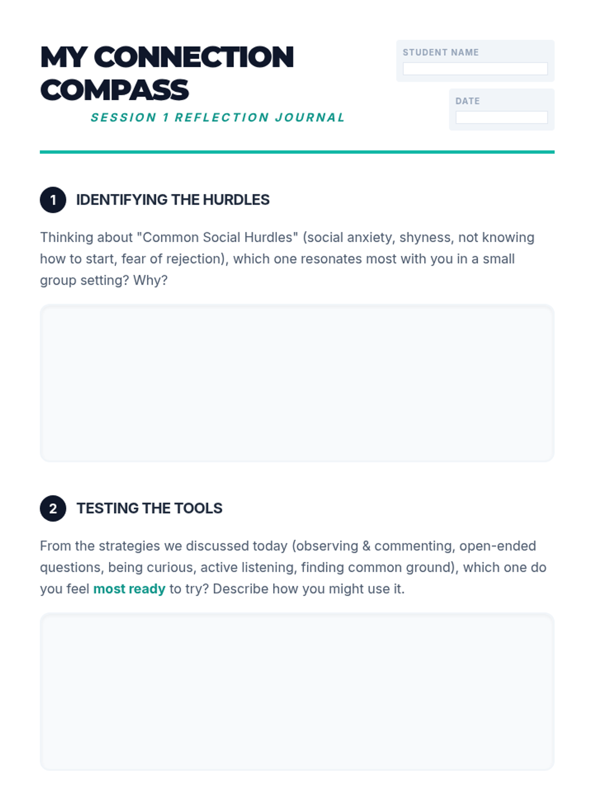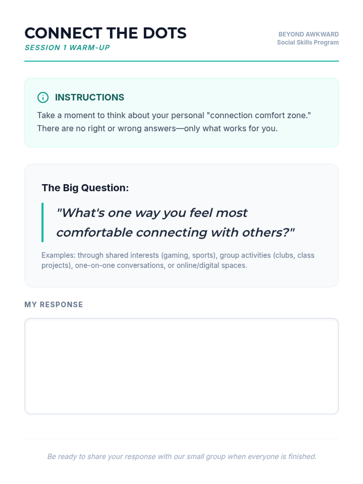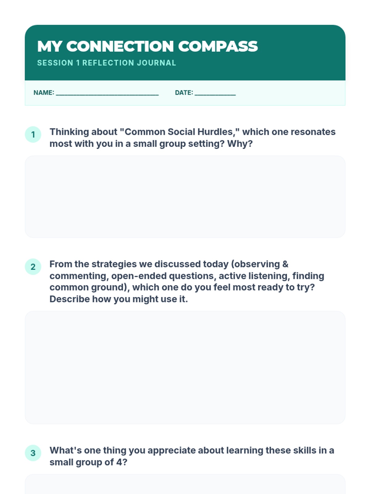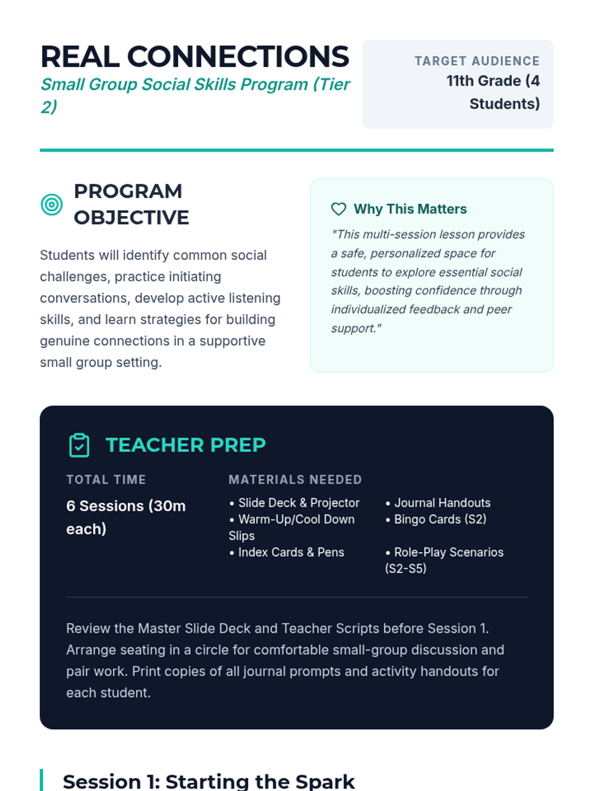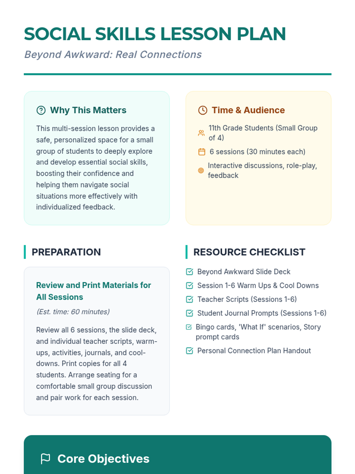 A comprehensive 6-session social skills curriculum designed for 11th-grade students to navigate social anxiety and build authentic connections through interactive practice and reflection.