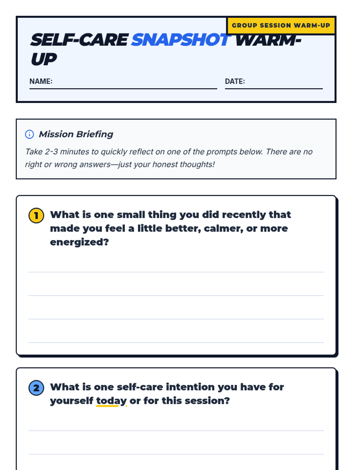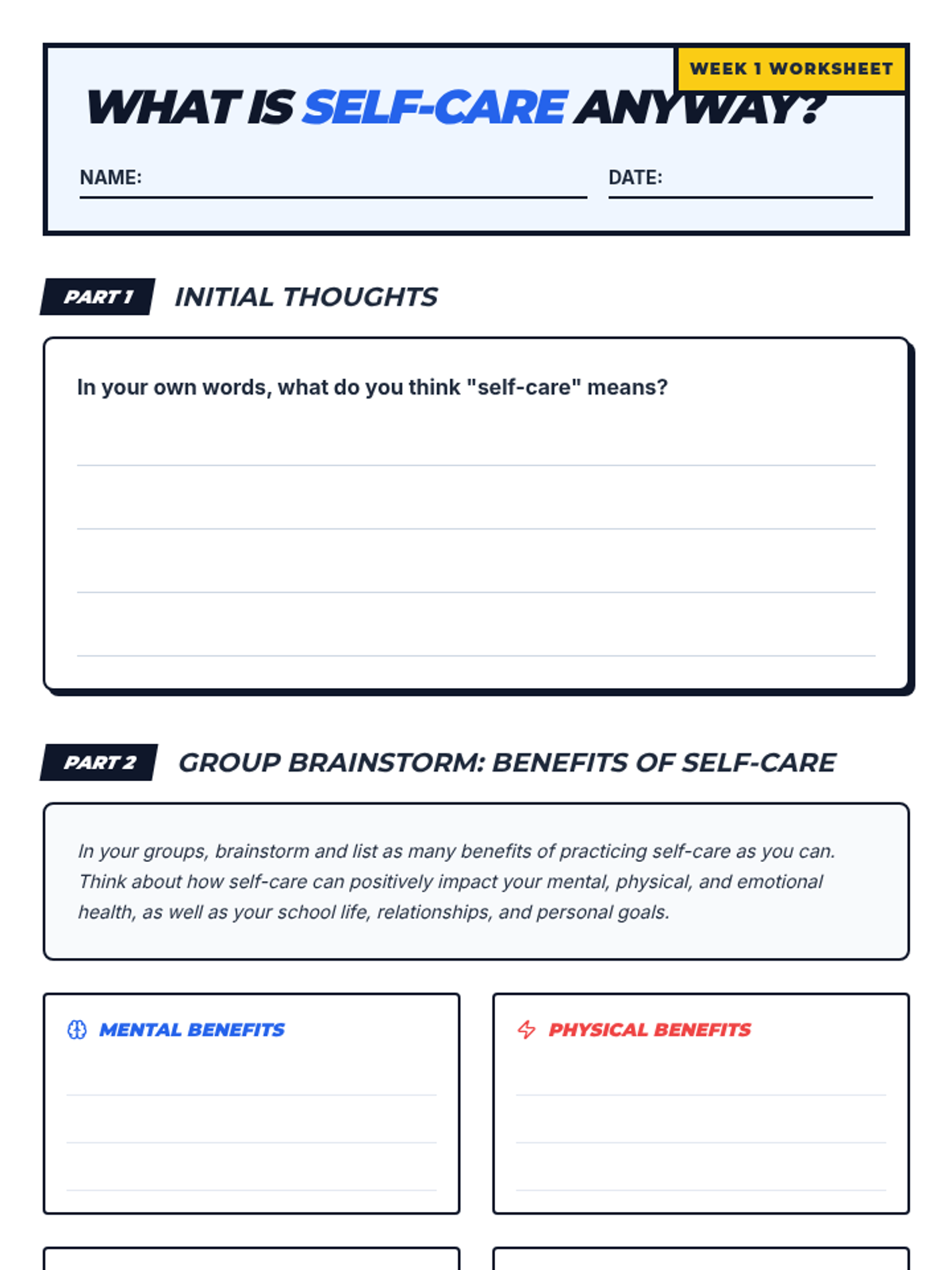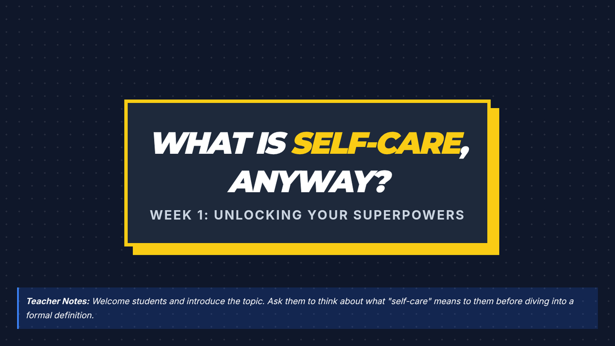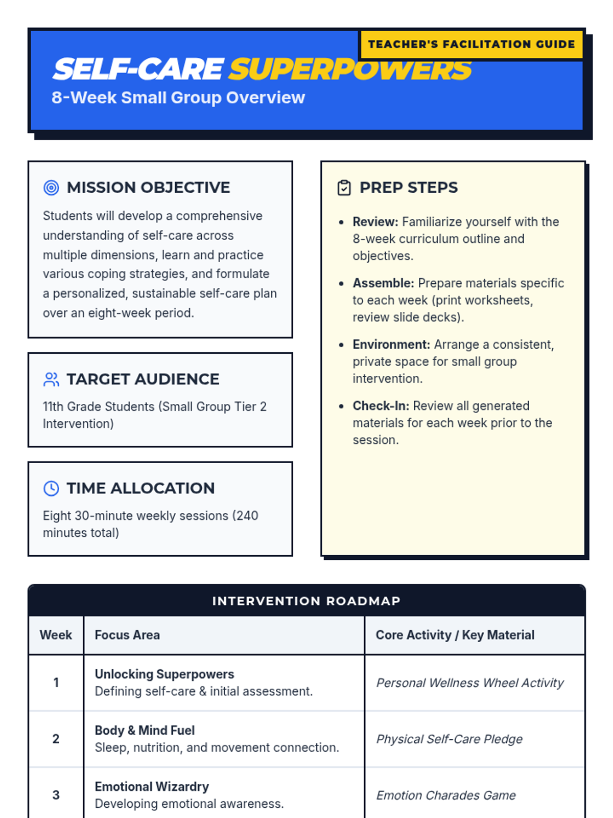 An eight-week small group intervention (Tier 2) designed to help 11th-grade students explore, practice, and integrate self-care strategies into their daily lives for long-term well-being and resilience.