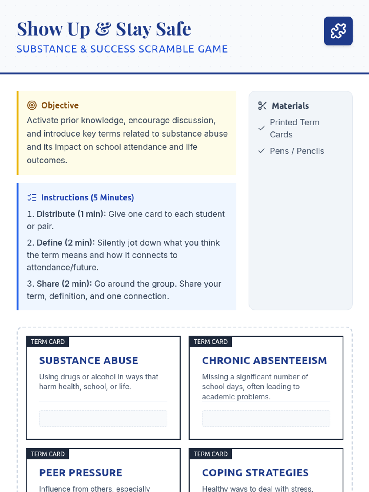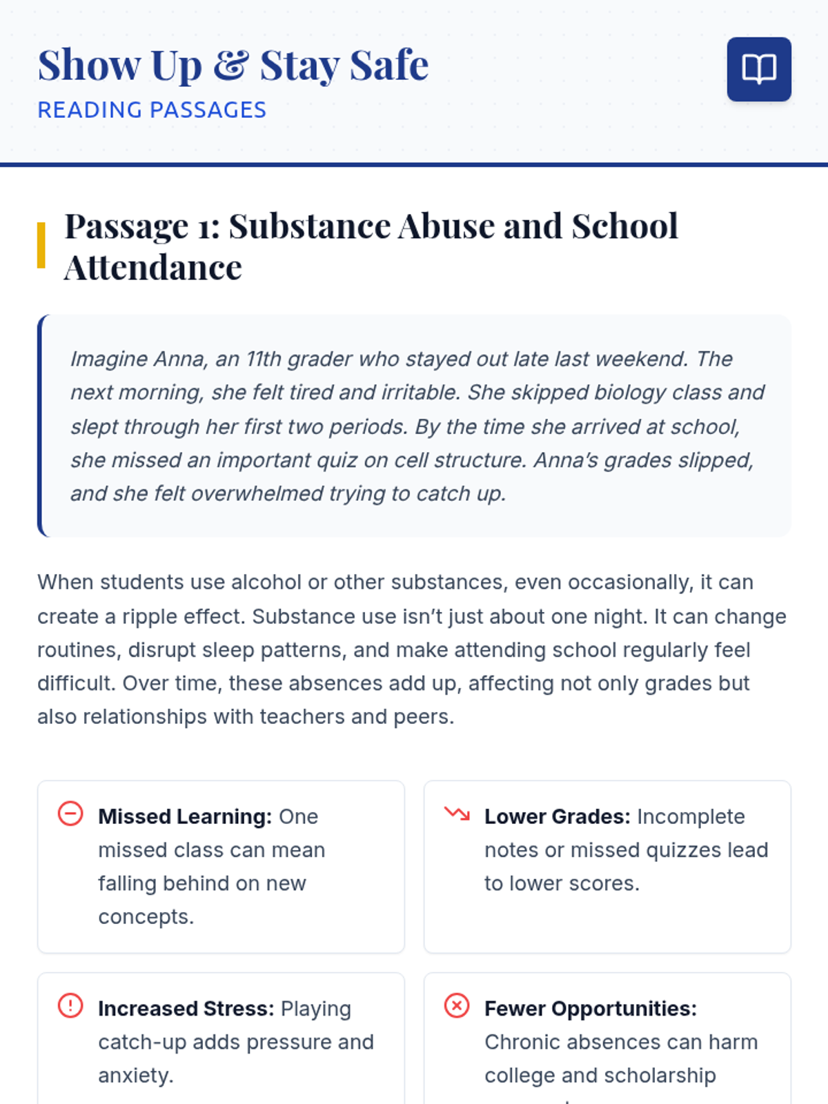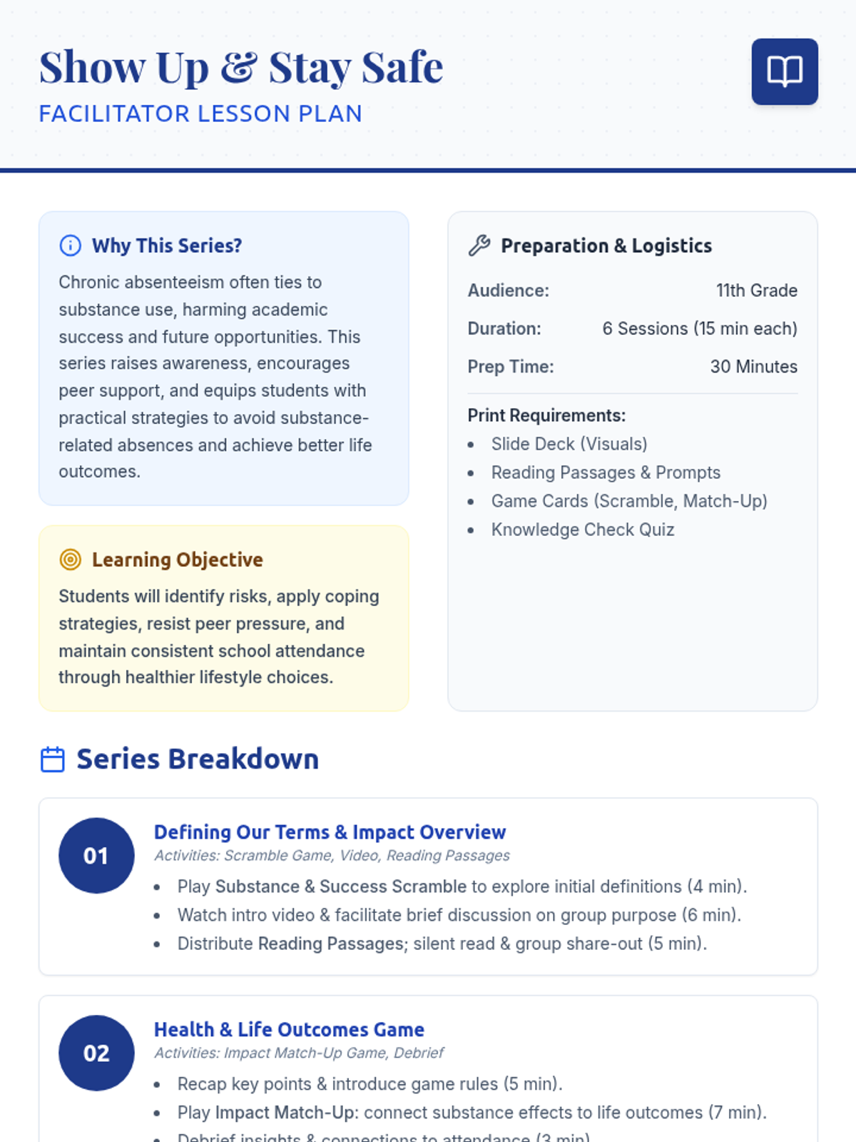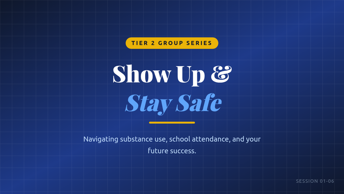 A 6-session, 15-minute Tier 2 group series for 11th graders to explore the impact of substance abuse on school attendance and life outcomes. Students develop refusal skills, coping strategies, and personal action plans to ensure consistent school attendance and healthy life choices.
