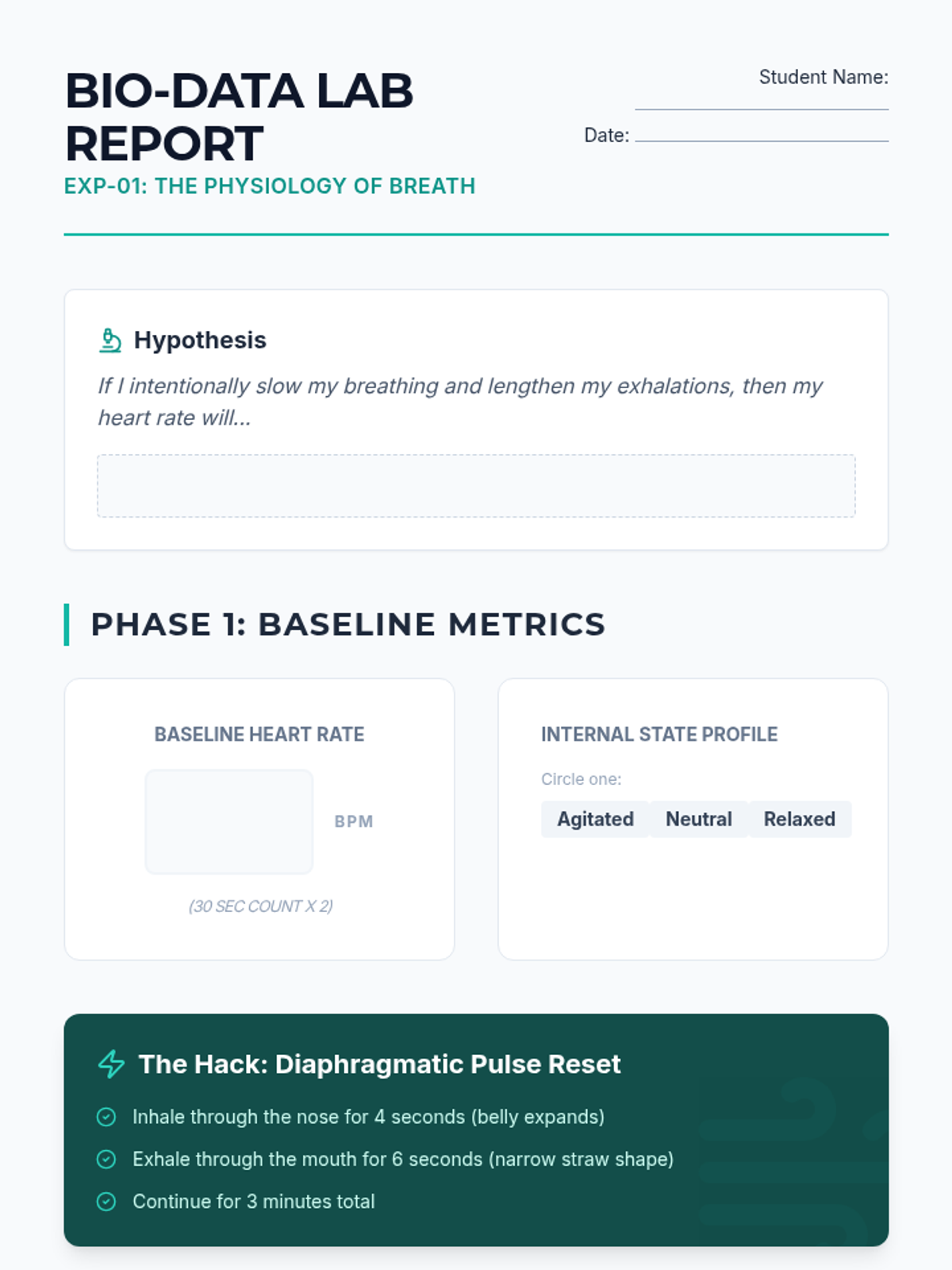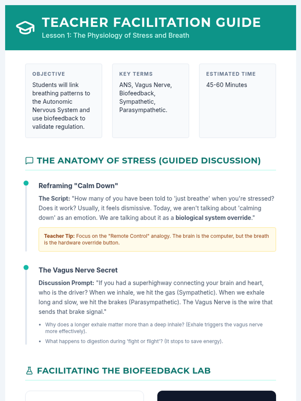 A sophisticated 5-lesson sequence for 11th-grade students exploring the biological connection between breathing and the nervous system. Students move from understanding anatomy to mastering specific techniques like box breathing and resonant frequency, culminating in a personalized regulation toolkit for independent living.