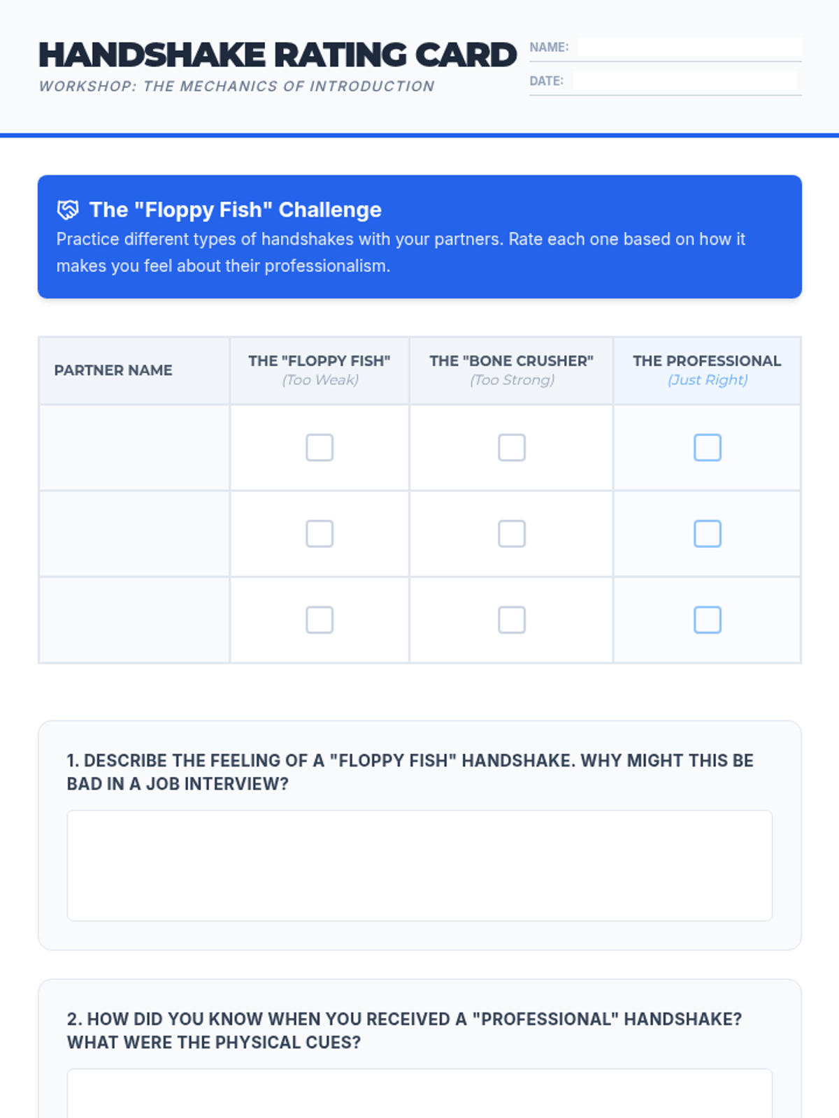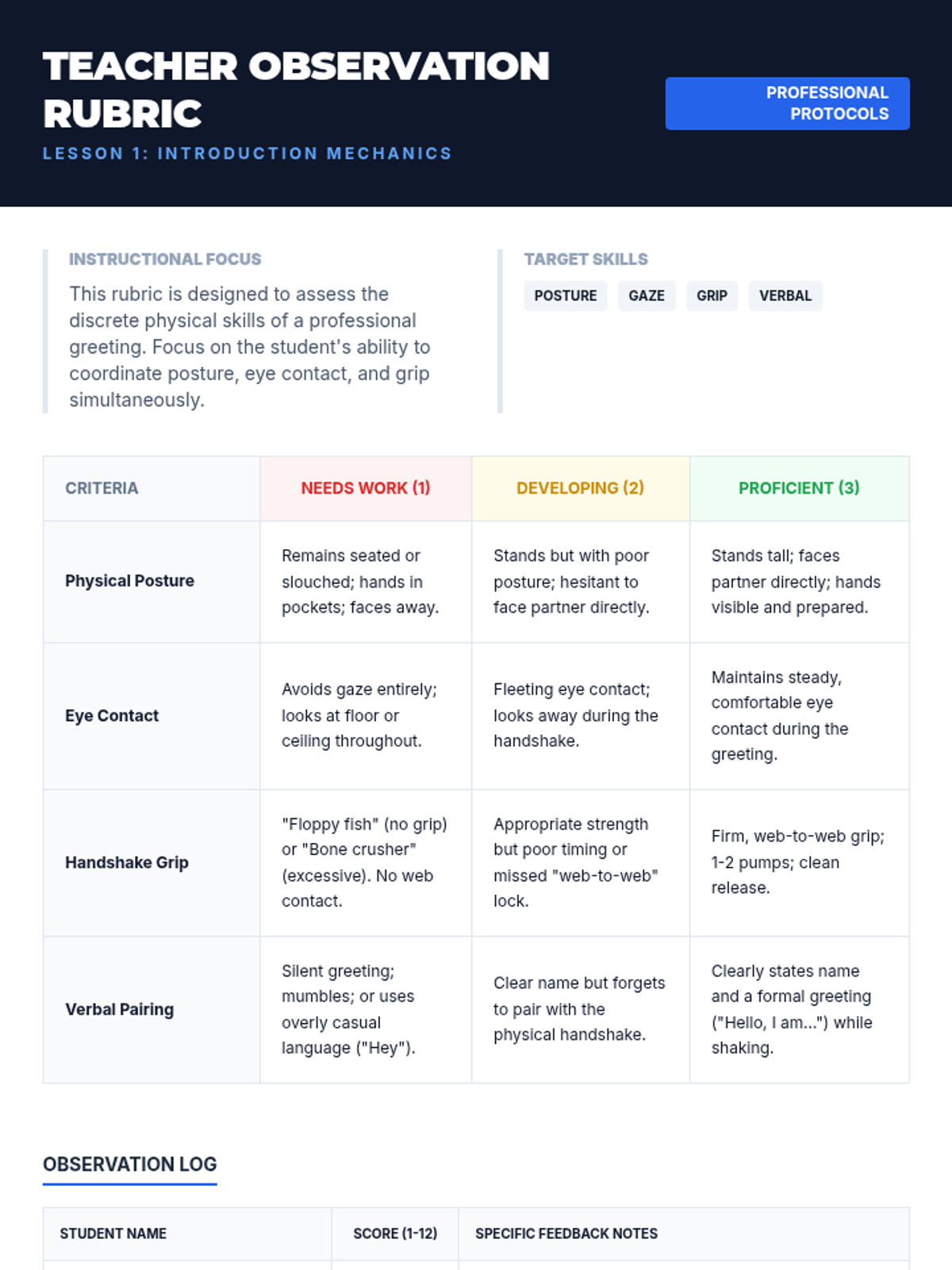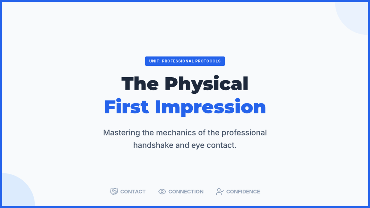 This sequence prepares 11th-grade students for professional environments by teaching the nuances of workplace greetings. Students will master physical mechanics, hierarchy-based title selection, elevator pitches, and digital etiquette through role-play and simulation.