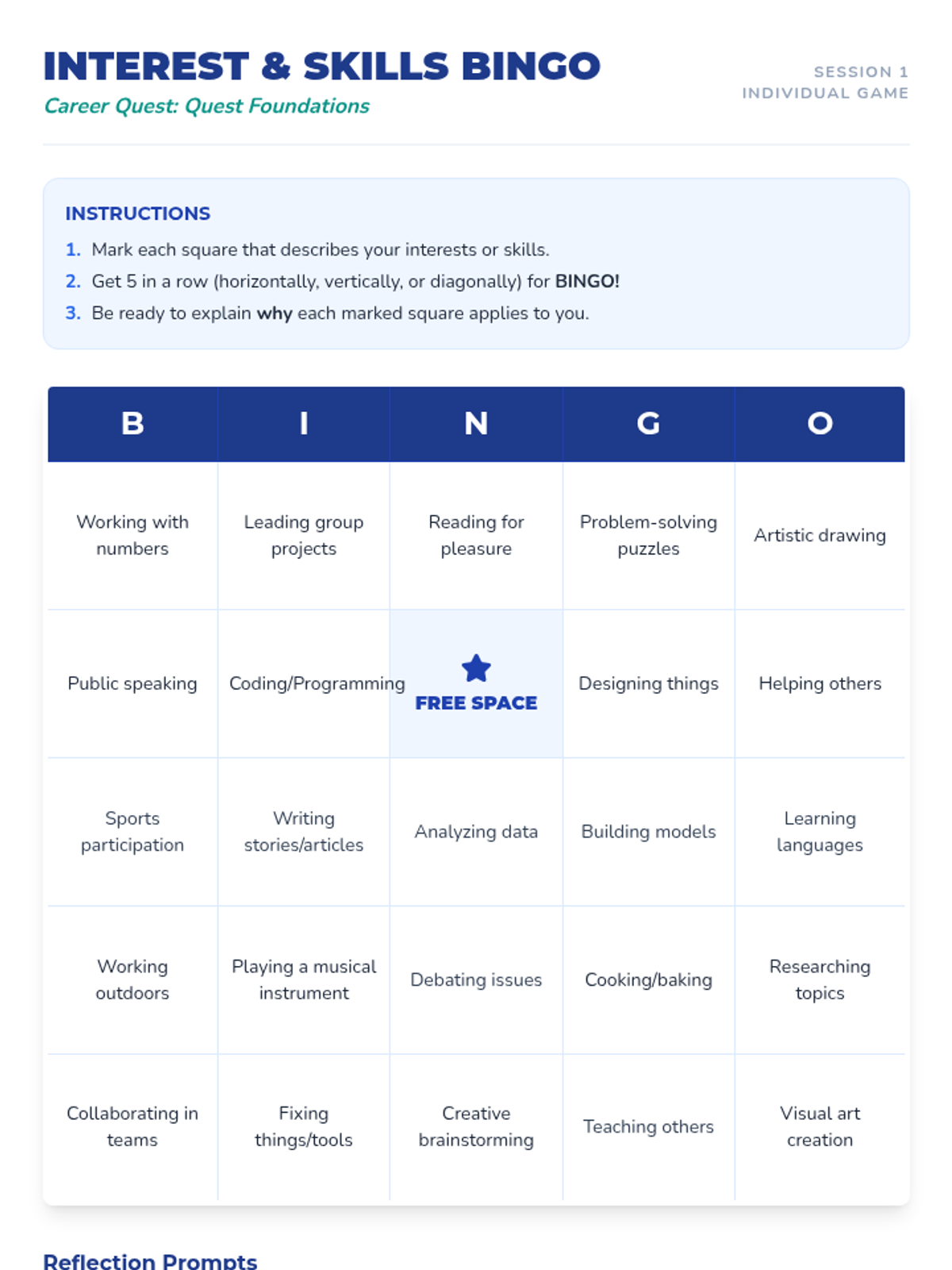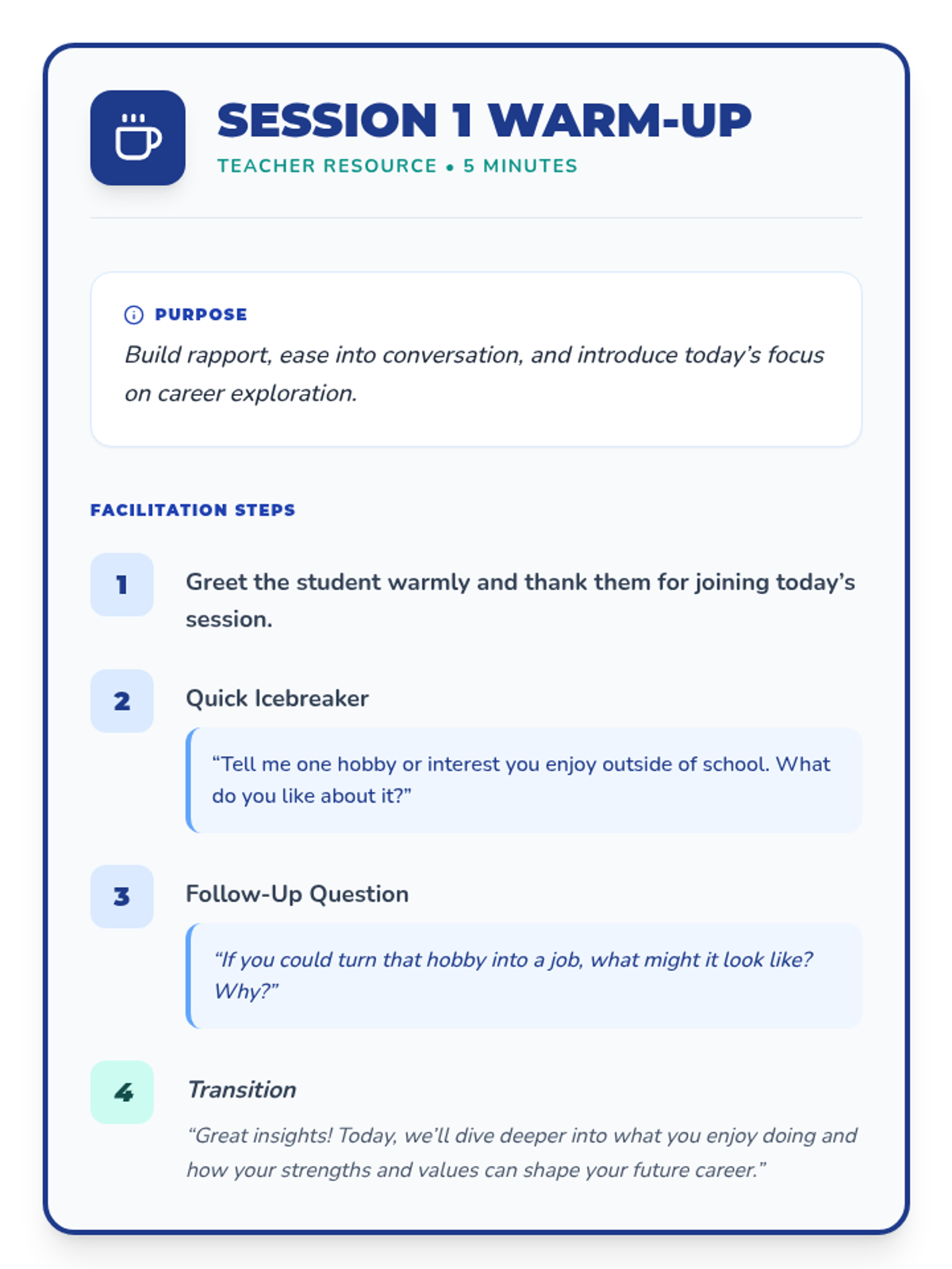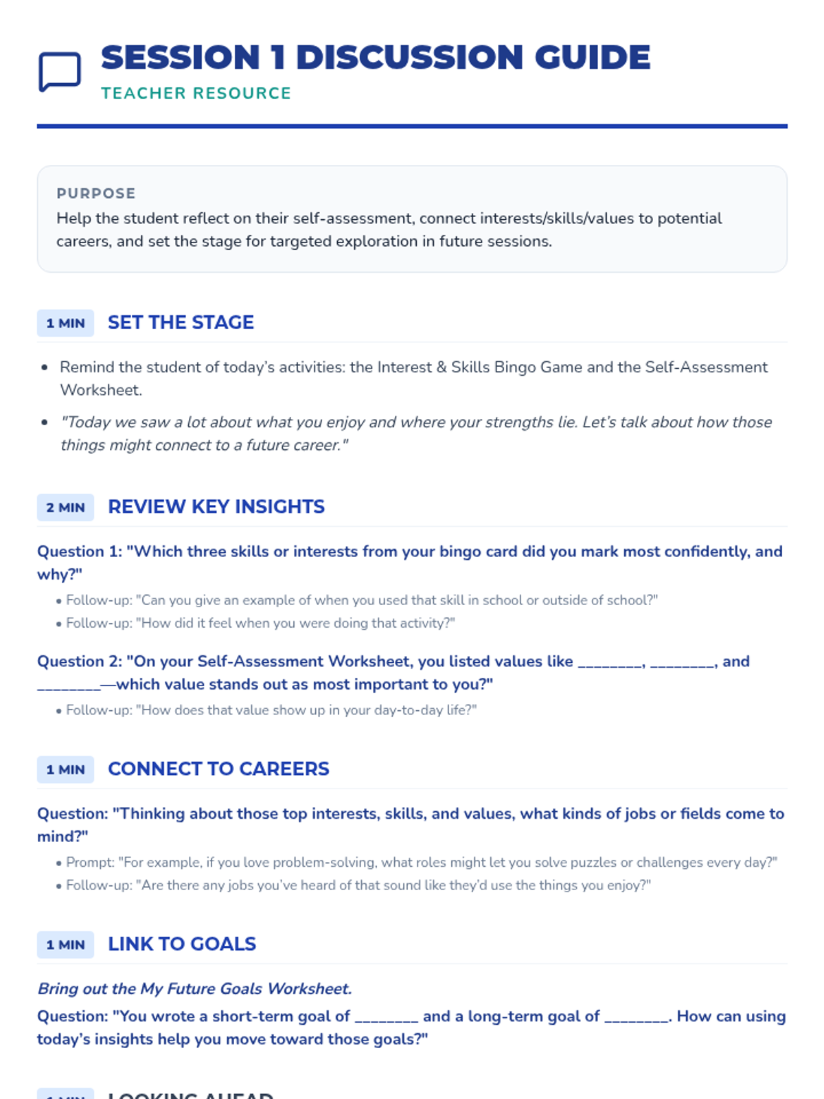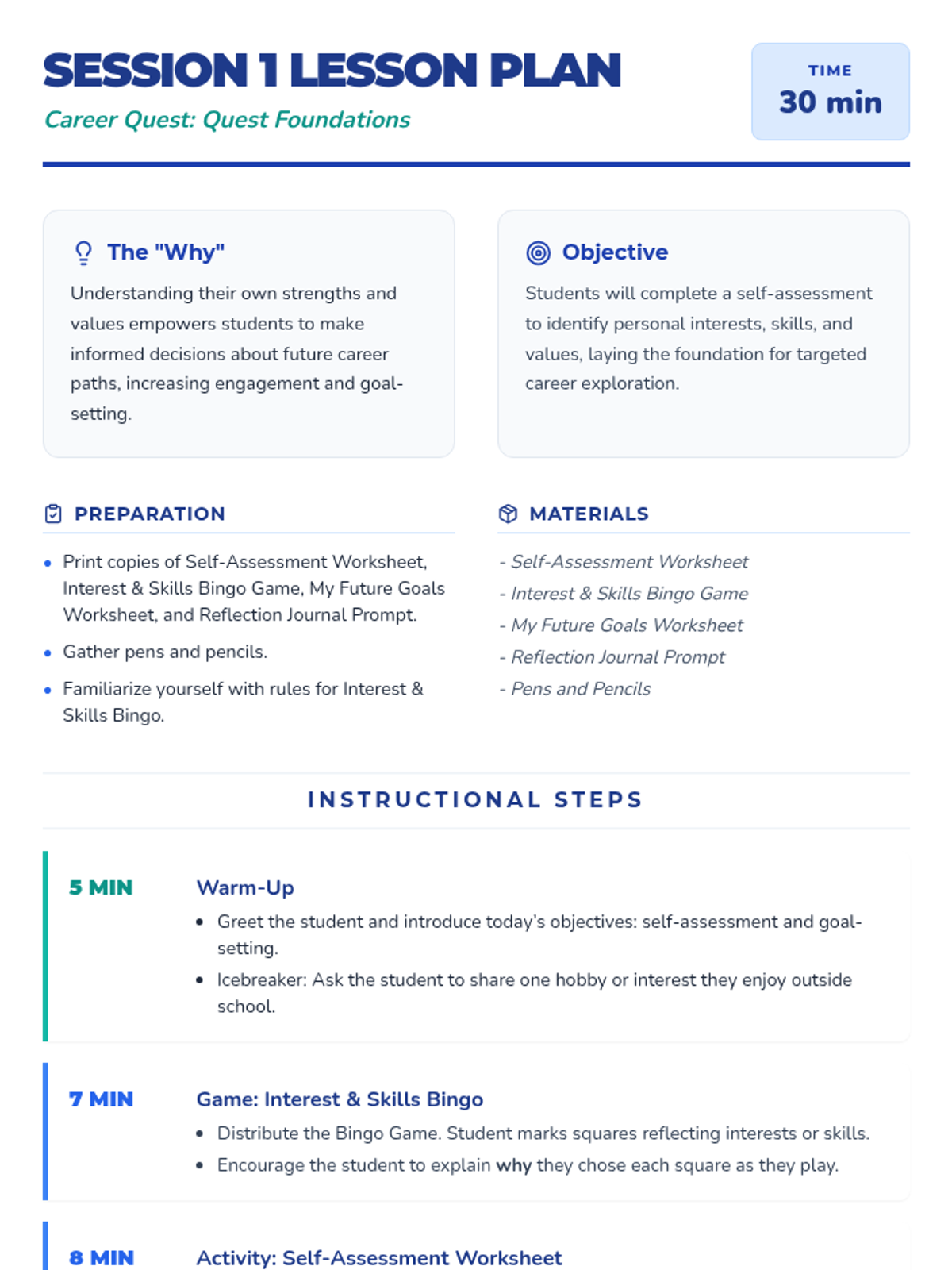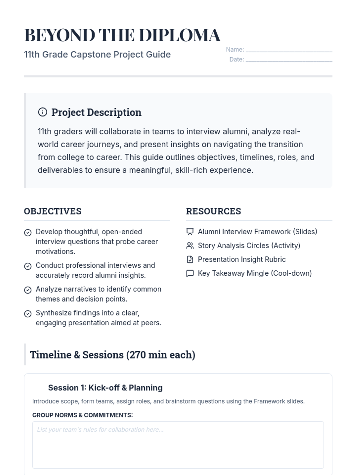 A 10-session individualized career exploration journey for 11th-grade students, focusing on self-assessment, research, professional branding, and networking for postsecondary success.