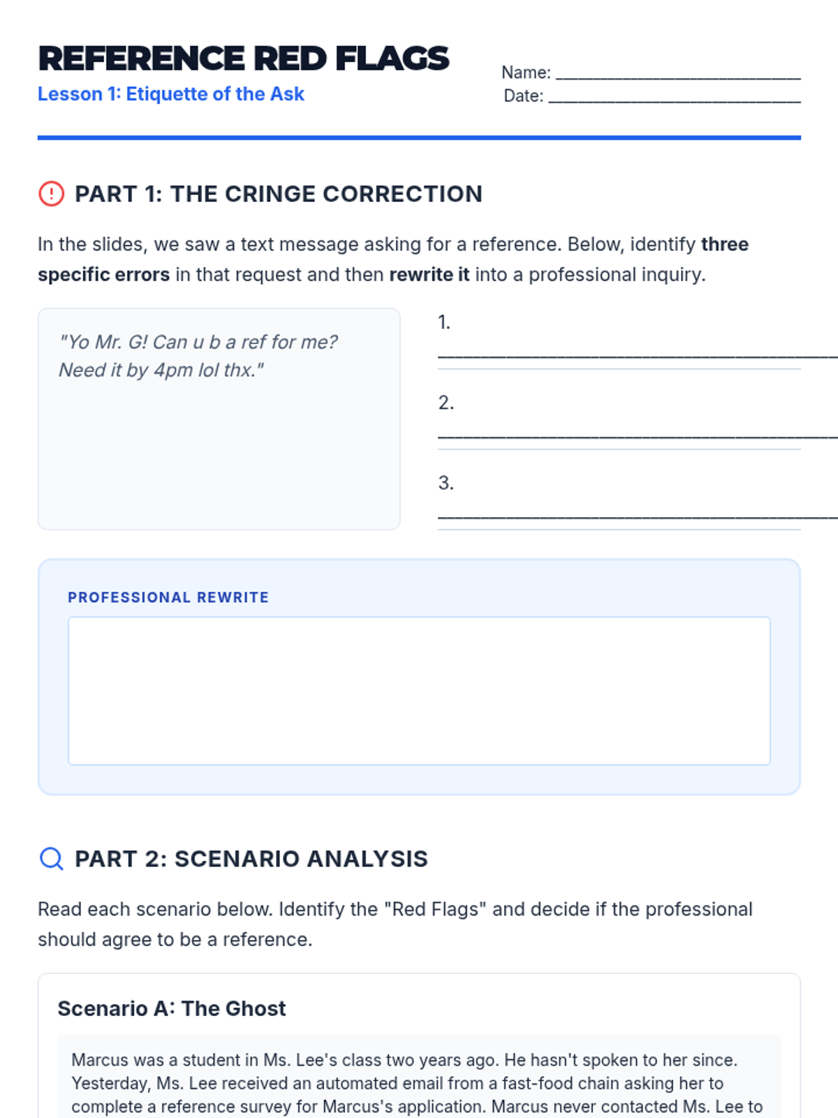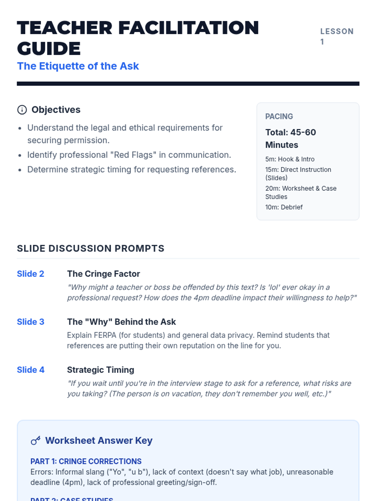 A comprehensive 5-lesson workshop series for 11th graders on the professional etiquette, communication, and strategy required to secure and manage professional references effectively.