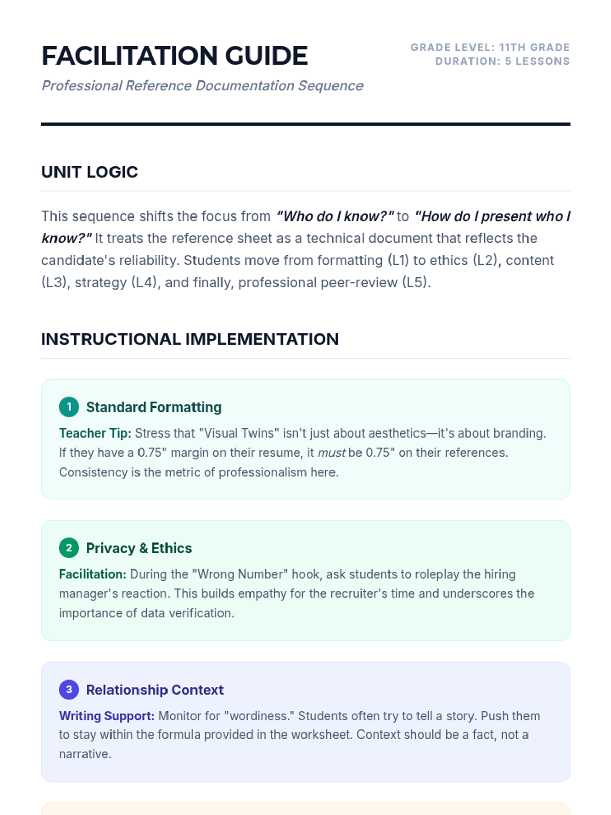 A comprehensive project-based sequence for 11th graders focusing on the technical and ethical aspects of professional reference documentation. Students will develop a master reference list, learn industry-standard formatting, and practice tailoring their lists for specific job applications.