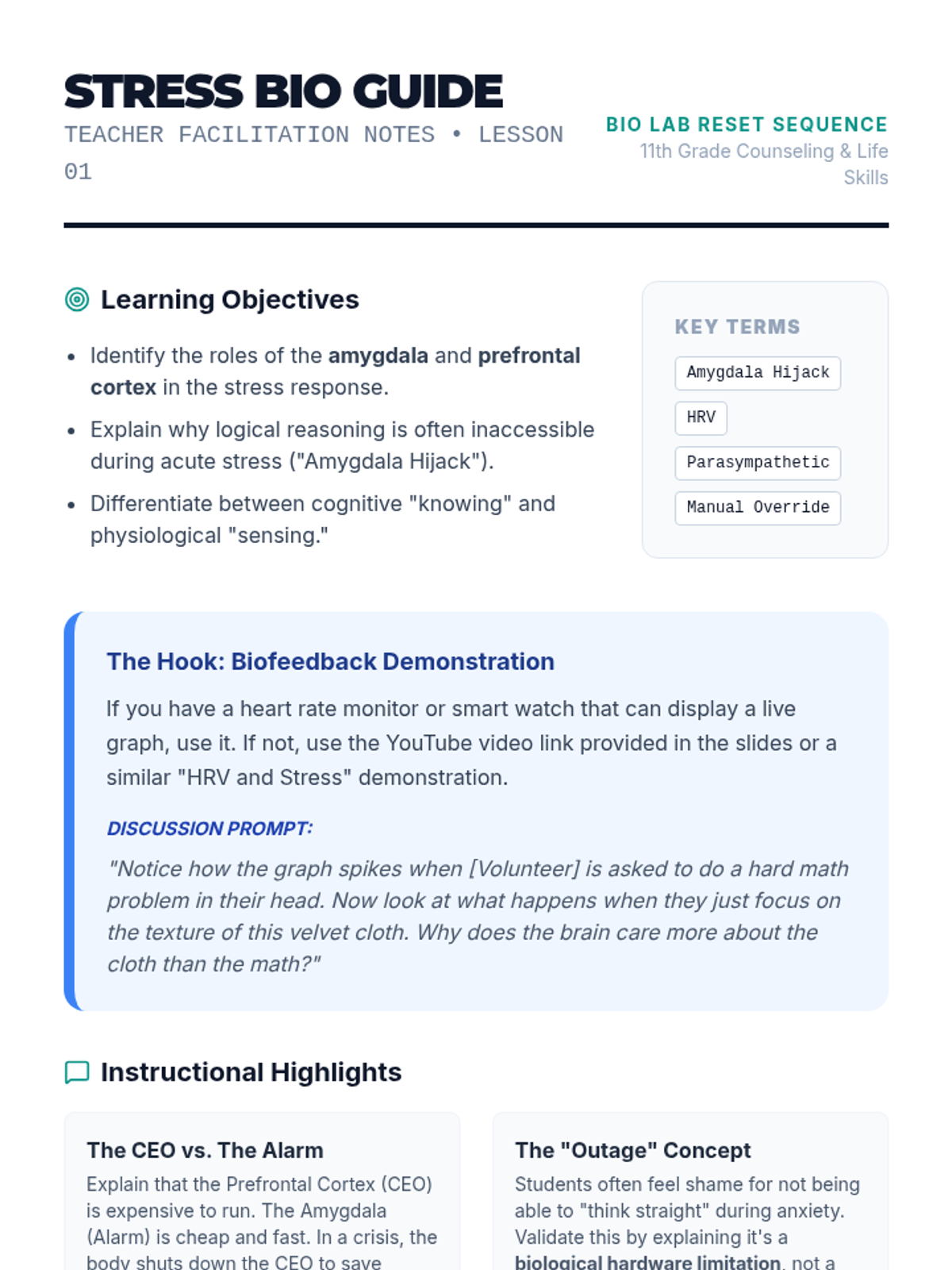 A comprehensive sequence for 11th-grade students to understand the neurobiology of stress and master somatic, sensory, and cognitive grounding techniques for emotional regulation.