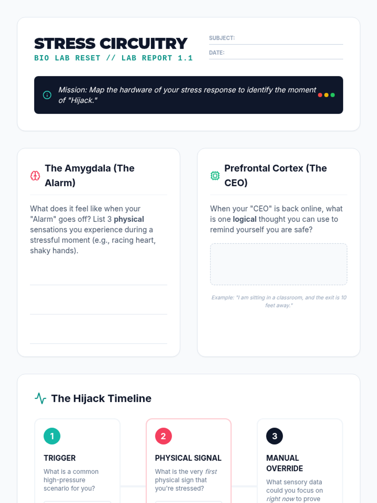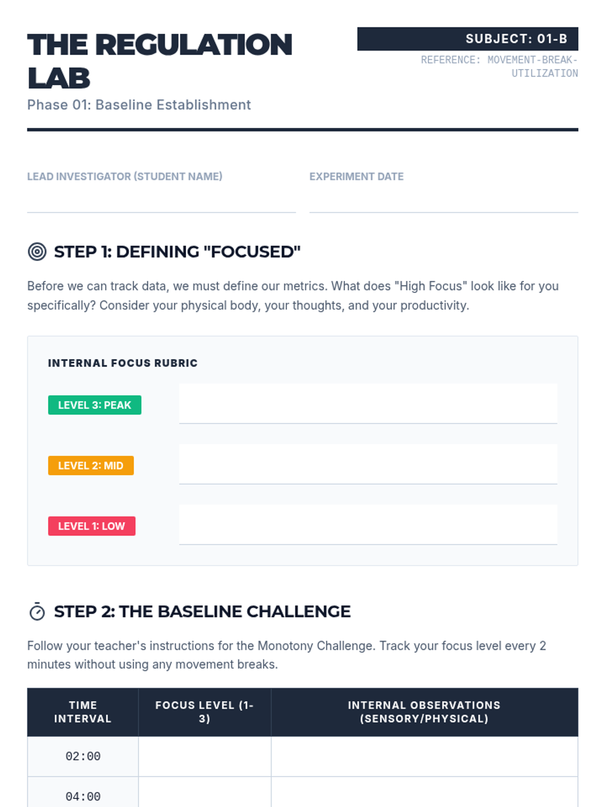 An analytical sequence for 11th-grade students focusing on data-driven self-management. Students treat their self-regulation as a scientific experiment, using logs to track triggers and measure the efficacy of movement interventions to move from reactive coping to proactive scheduling.