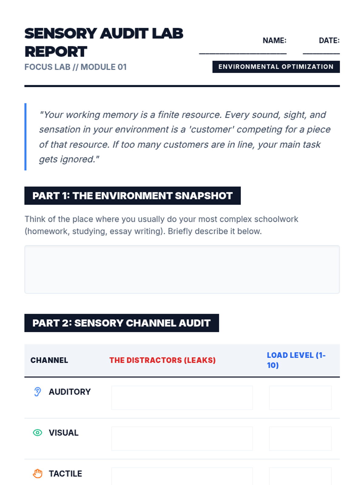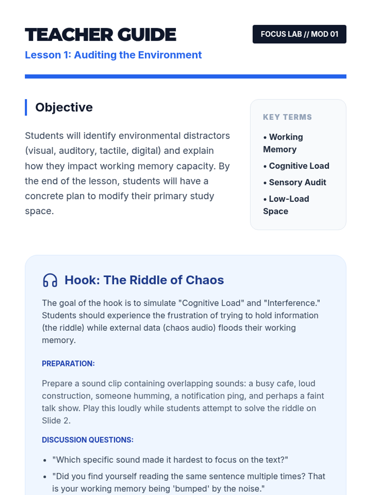 Focusing on self-awareness, this sequence helps 11th-grade students identify internal and external distractors that deplete working memory resources. Students learn to monitor their attention span, implement environmental controls, and develop a personalized 'Attention Regulation Profile' through case studies, time-boxing practice, and mindful resets.