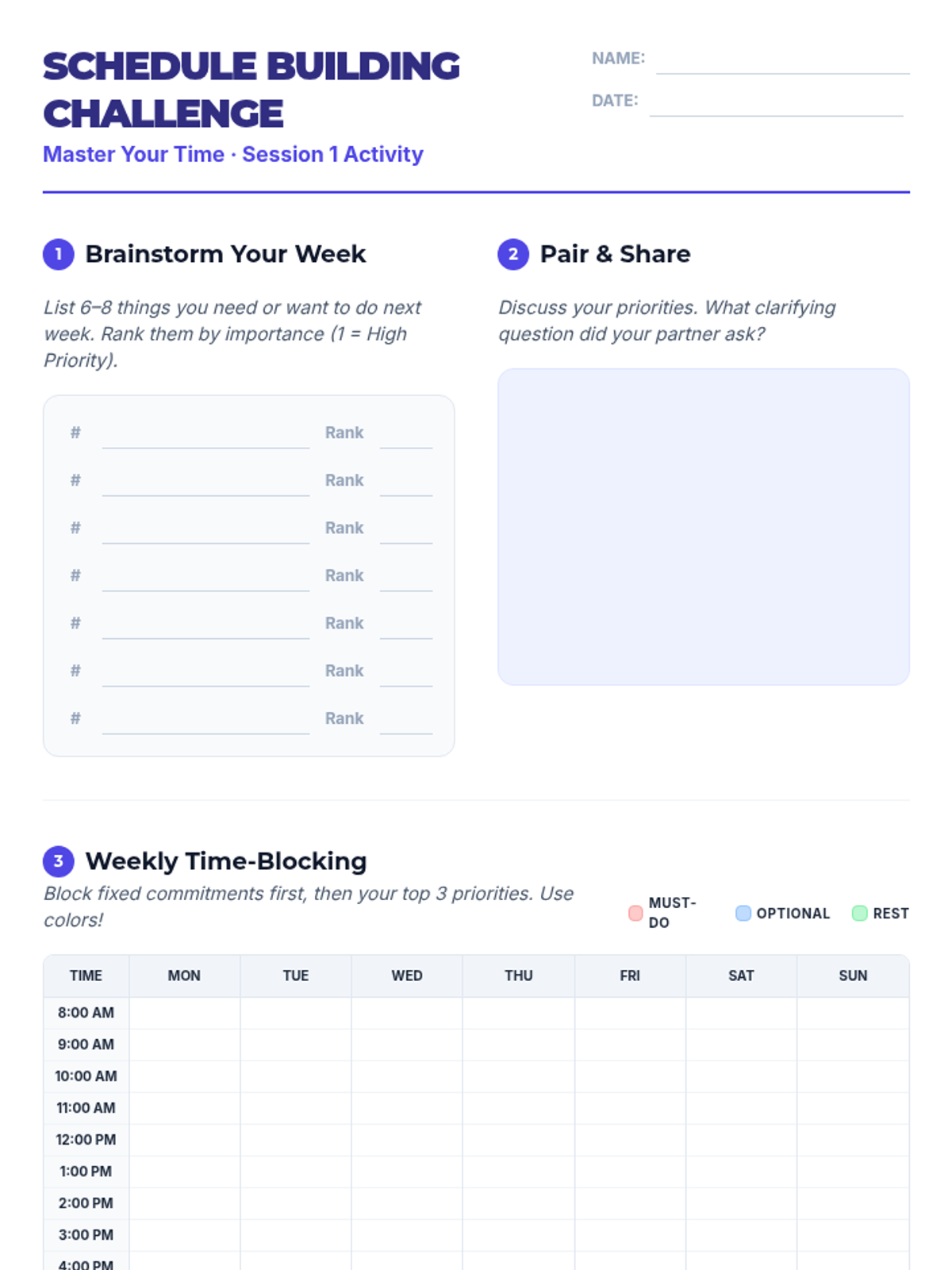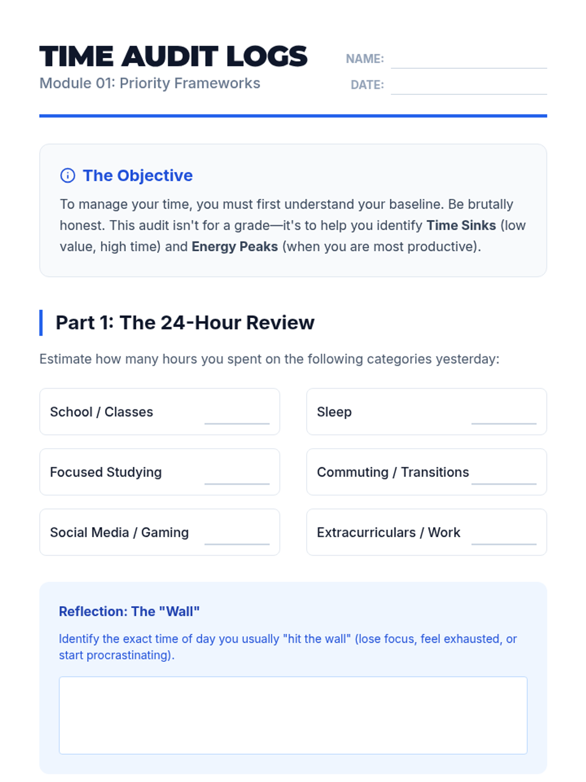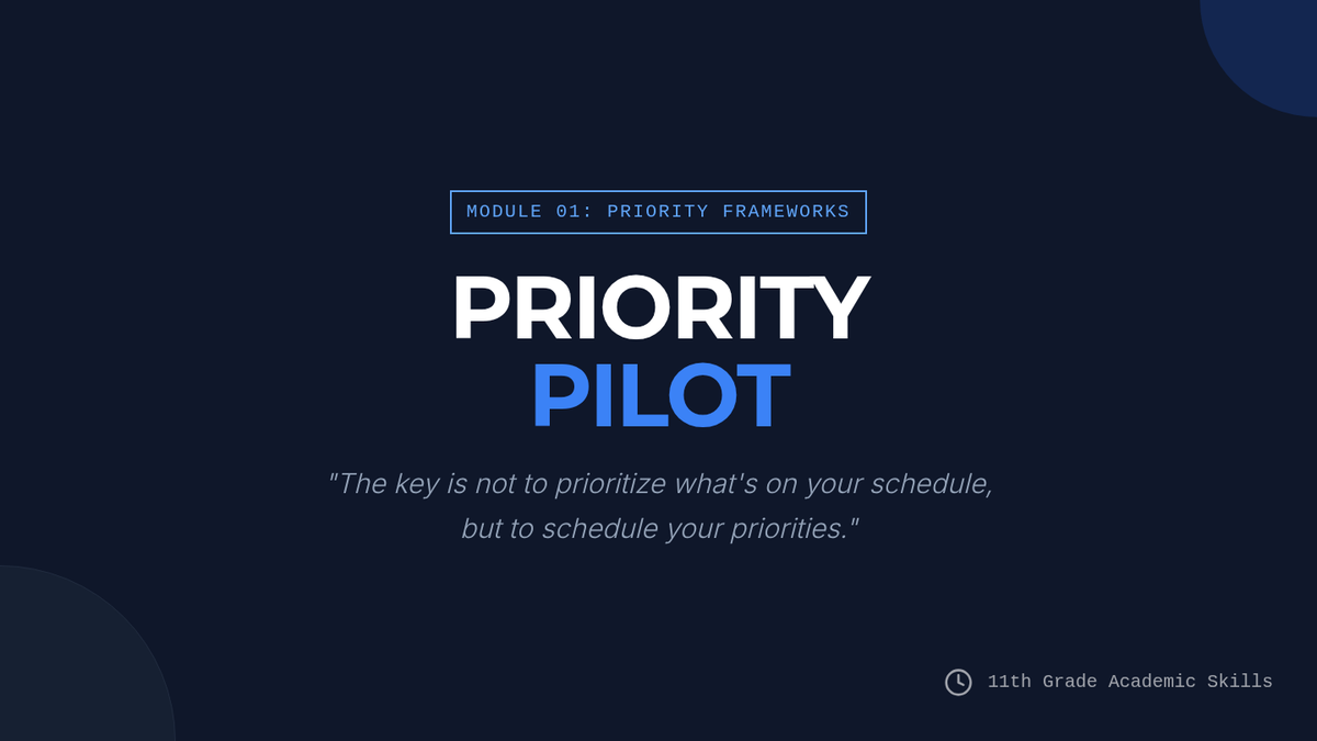 A comprehensive unit for 11th-grade students to master the executive functions of time management, memory science, and exam performance. Students move from auditing current habits to applying the Eisenhower Matrix, learning active recall techniques, decoding complex exam prompts, and managing test anxiety, culminating in a personalized two-week study plan.