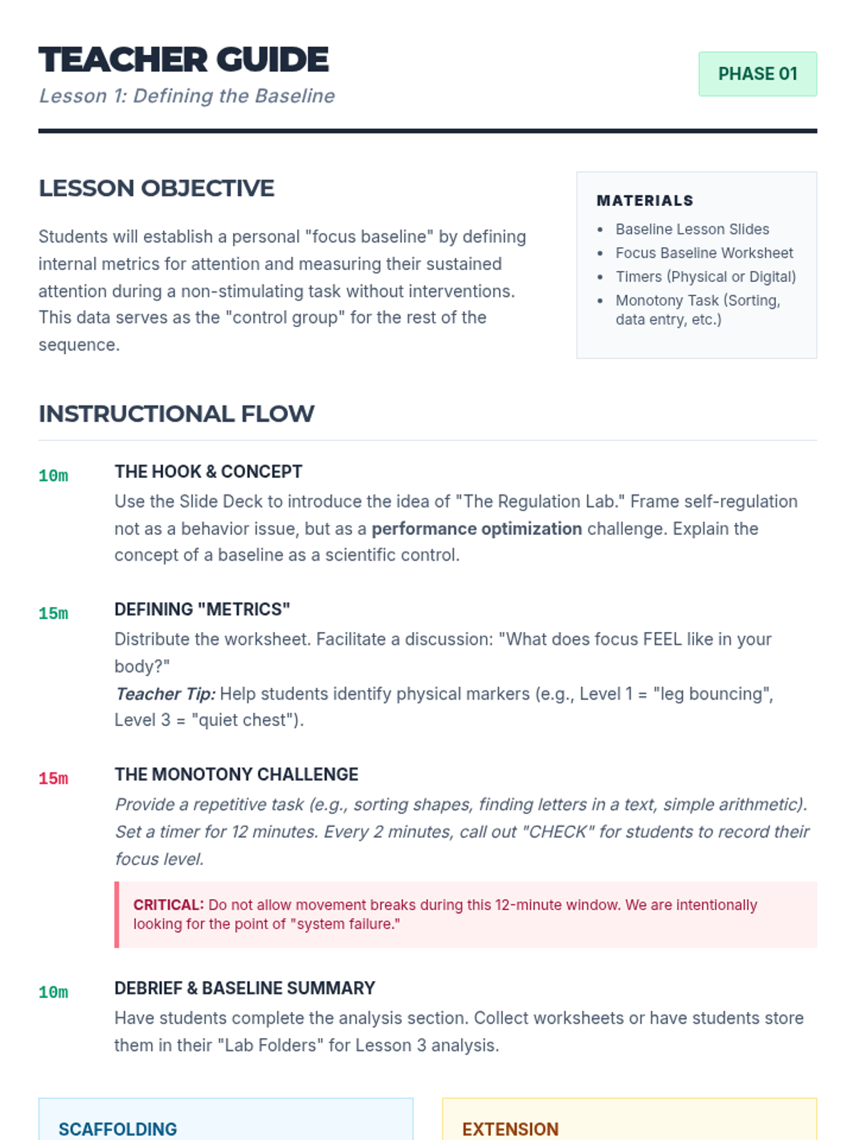 This sequence guides students through the internal process of self-assessment required for effective daily check-ins. Students learn to recognize physiological cues and environmental triggers that impact their readiness to learn, eventually developing a personalized 2-minute mental scan protocol.