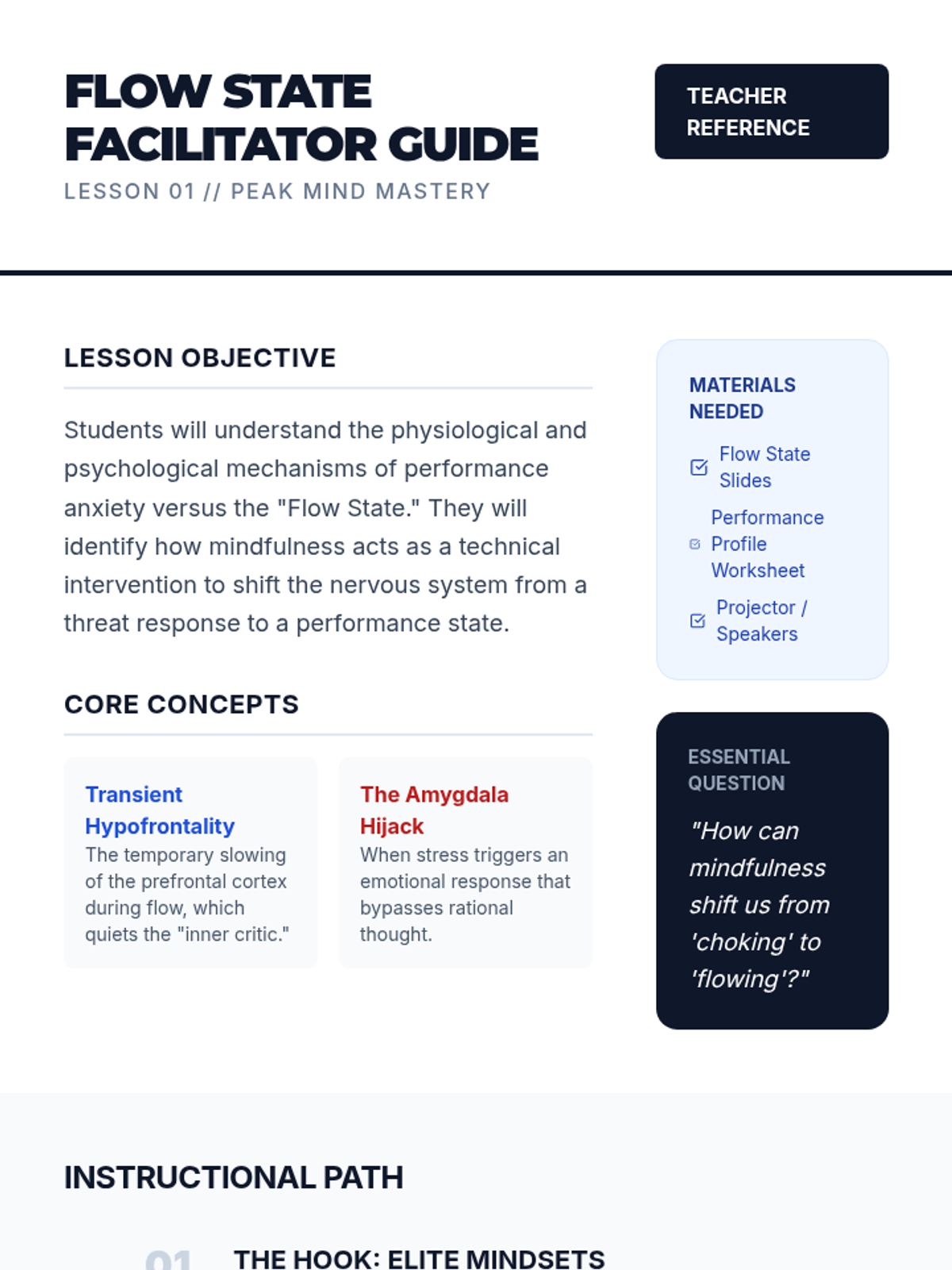 A high-performance mindfulness curriculum designed for 11th graders to enhance focus, manage academic stress, and optimize athletic performance using meditation as a cognitive tool.