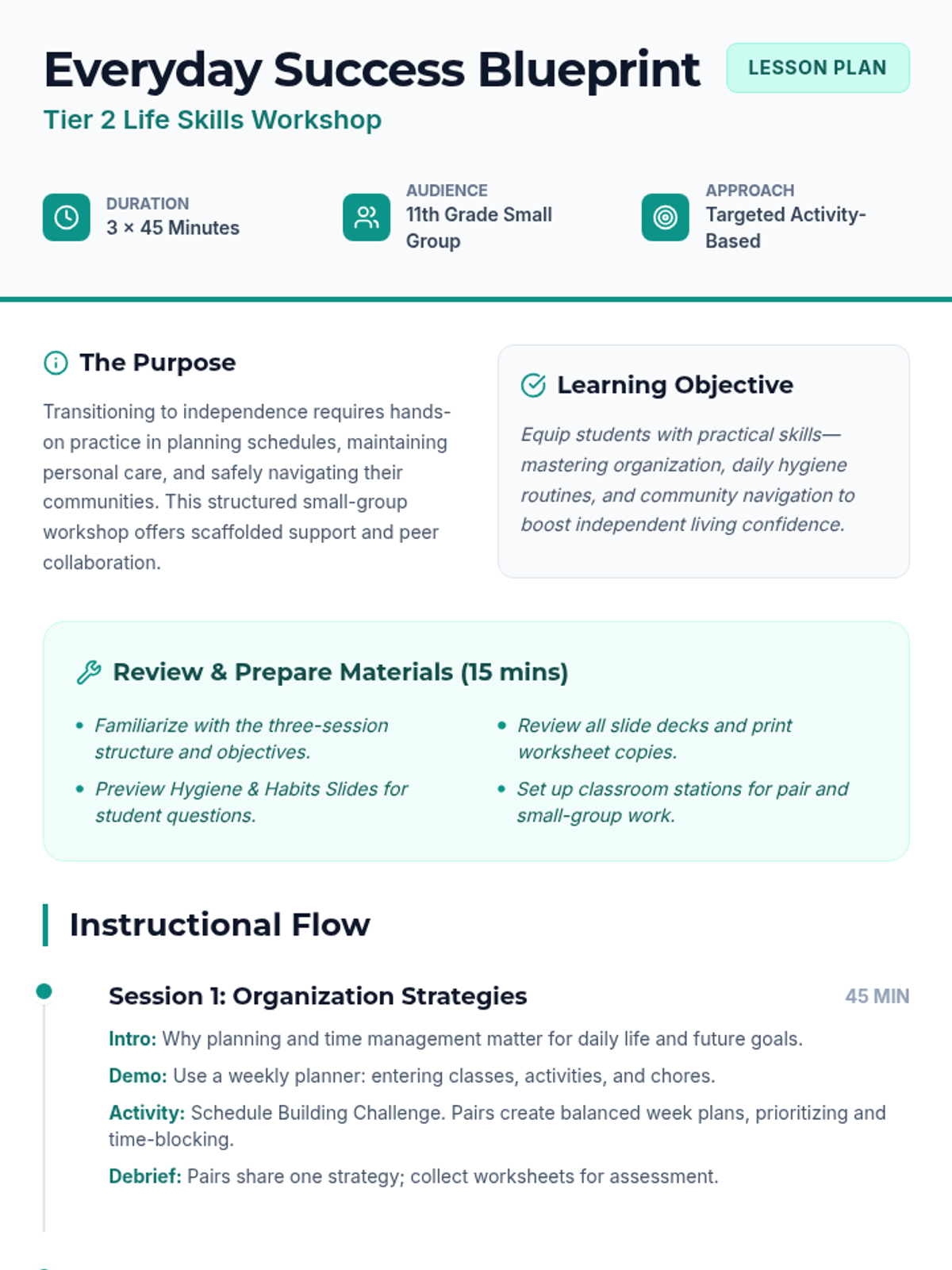 A three-session workshop for 11th graders focusing on essential life skills like organization, hygiene, and community navigation to foster independence.