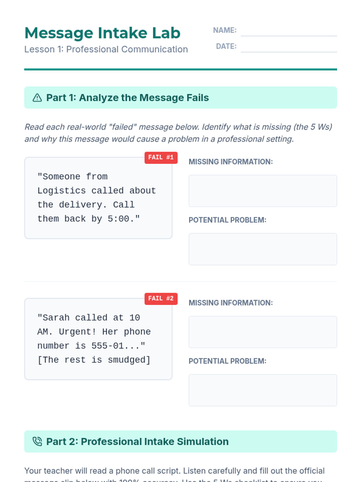 Written and verbal communication standards for the workplace, including email etiquette, presentation delivery, and professional phone conduct. Develops collaborative skills for teamwork, constructive feedback, and efficient time management.