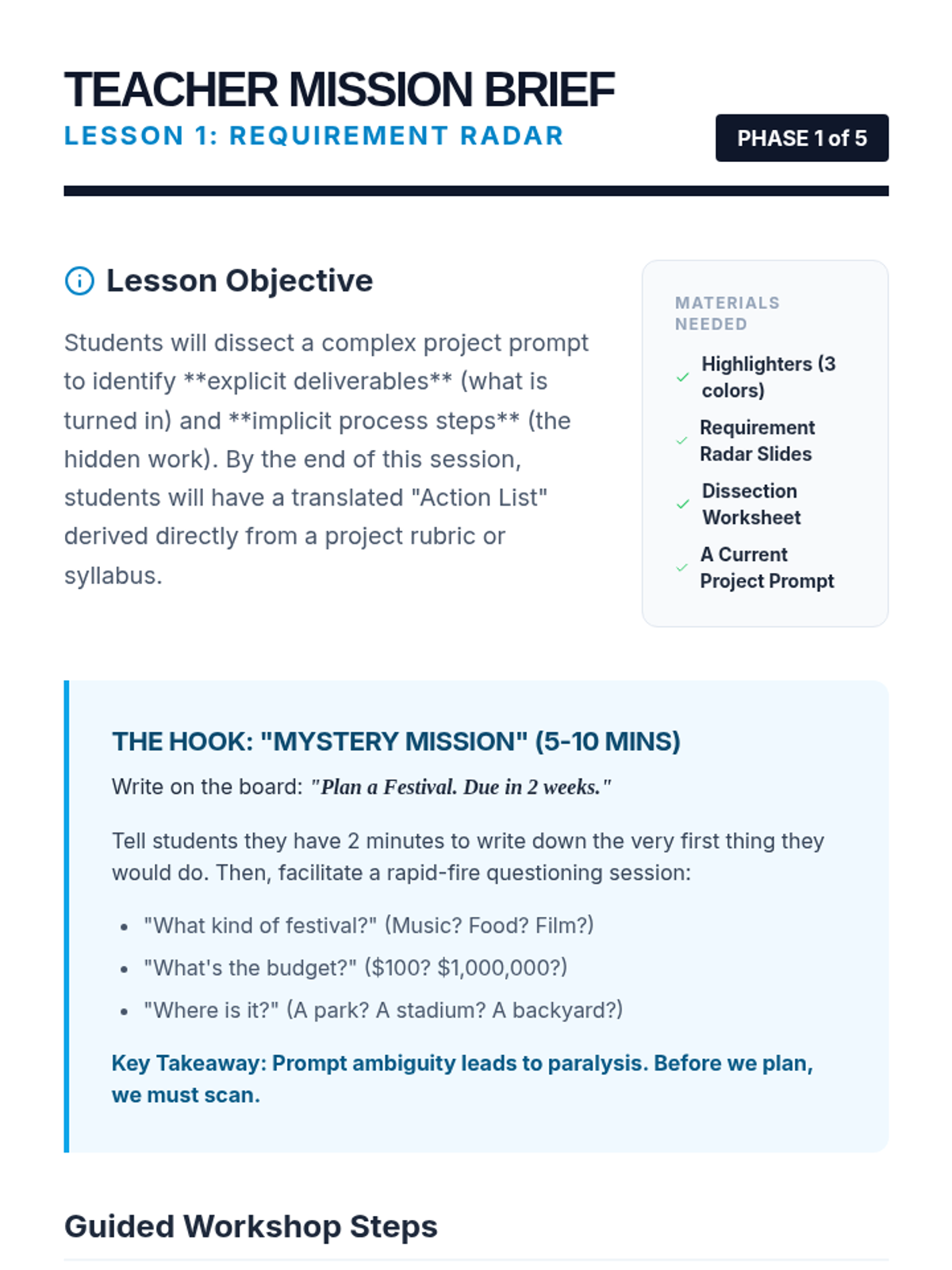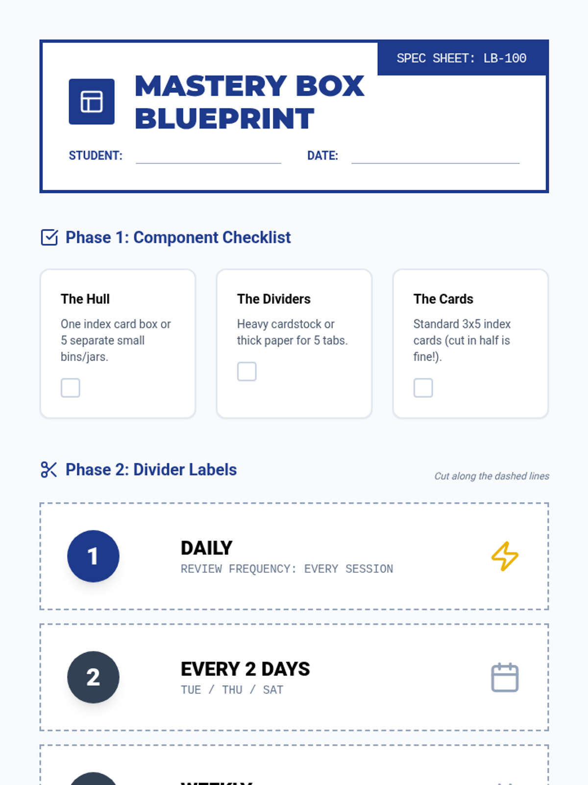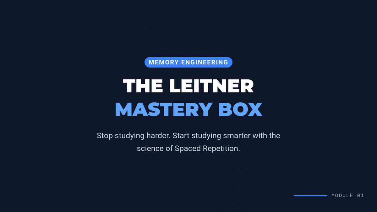 A comprehensive workshop sequence for 11th-grade students to master information using the physical Leitner System. Students build a tactile organization system, learn to synthesize complex content into atomic units, and develop executive function habits for consistent memory retention.