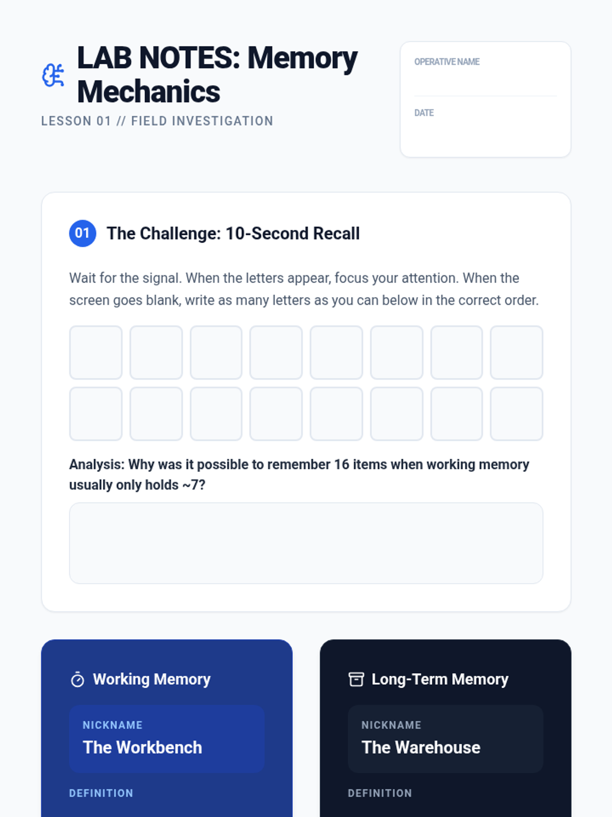 This sequence helps students understand and apply chunking and association strategies to overcome working memory limitations. Through a series of game-based lessons, students will learn to organize data into manageable patterns to increase their cognitive processing capacity.