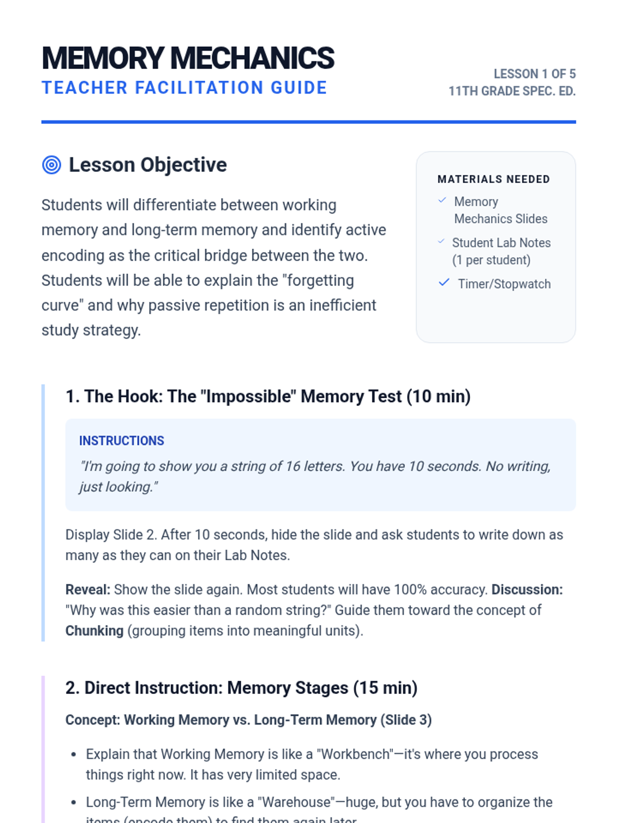 An inquiry-driven sequence for 11th-grade students focused on mnemonic devices and memory retention strategies. Students explore the psychology of encoding and develop a personalized library of 'brain hacks' to improve academic performance across their coursework.