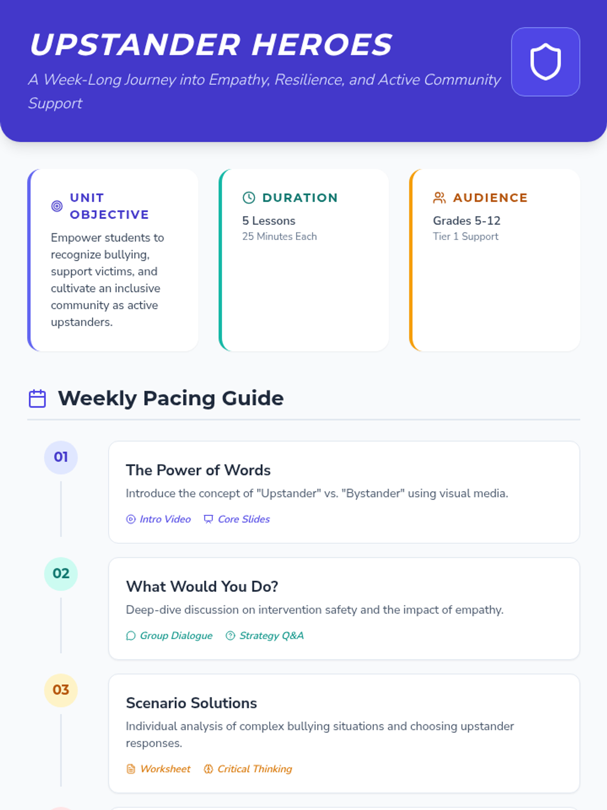 A comprehensive week-long unit designed to empower students to recognize bullying, support victims, and foster an inclusive community as active upstanders.