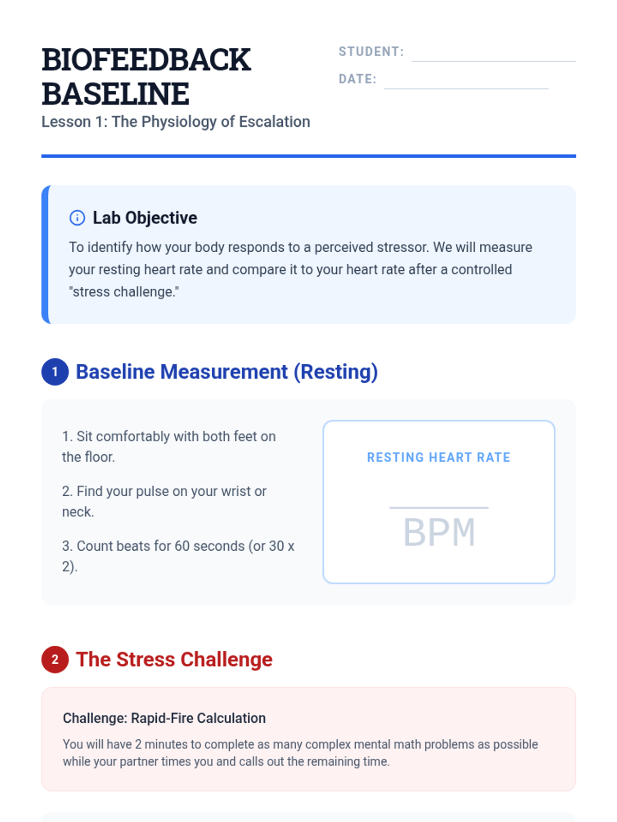 A mastery-based sequence where students treat themselves as the subject of a physiological experiment. They establish stress baselines, test TIPP interventions (Temperature, Intense Exercise, Paced Breathing, Paired Muscle Relaxation), and analyze personal data to build a verified, custom distress tolerance protocol.