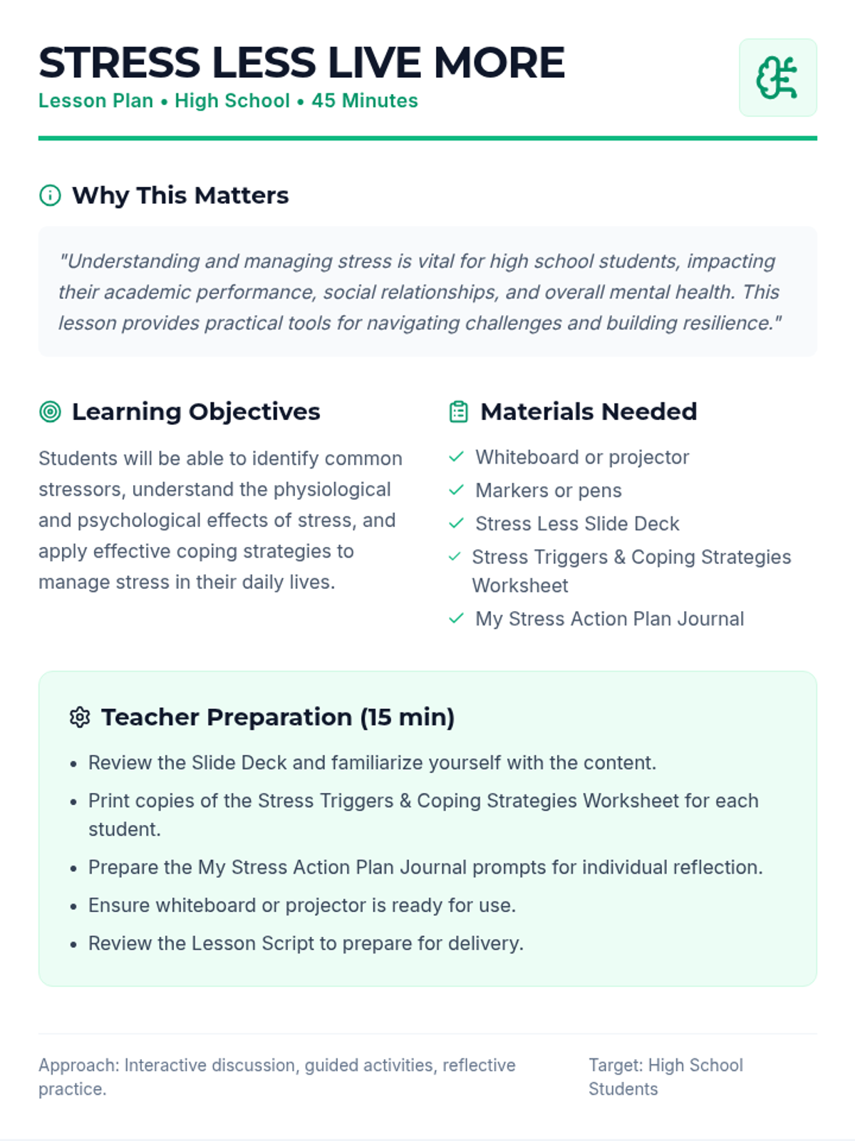A two-part intervention sequence for 11th graders to identify anxiety triggers and implement effective coping strategies for academic success.