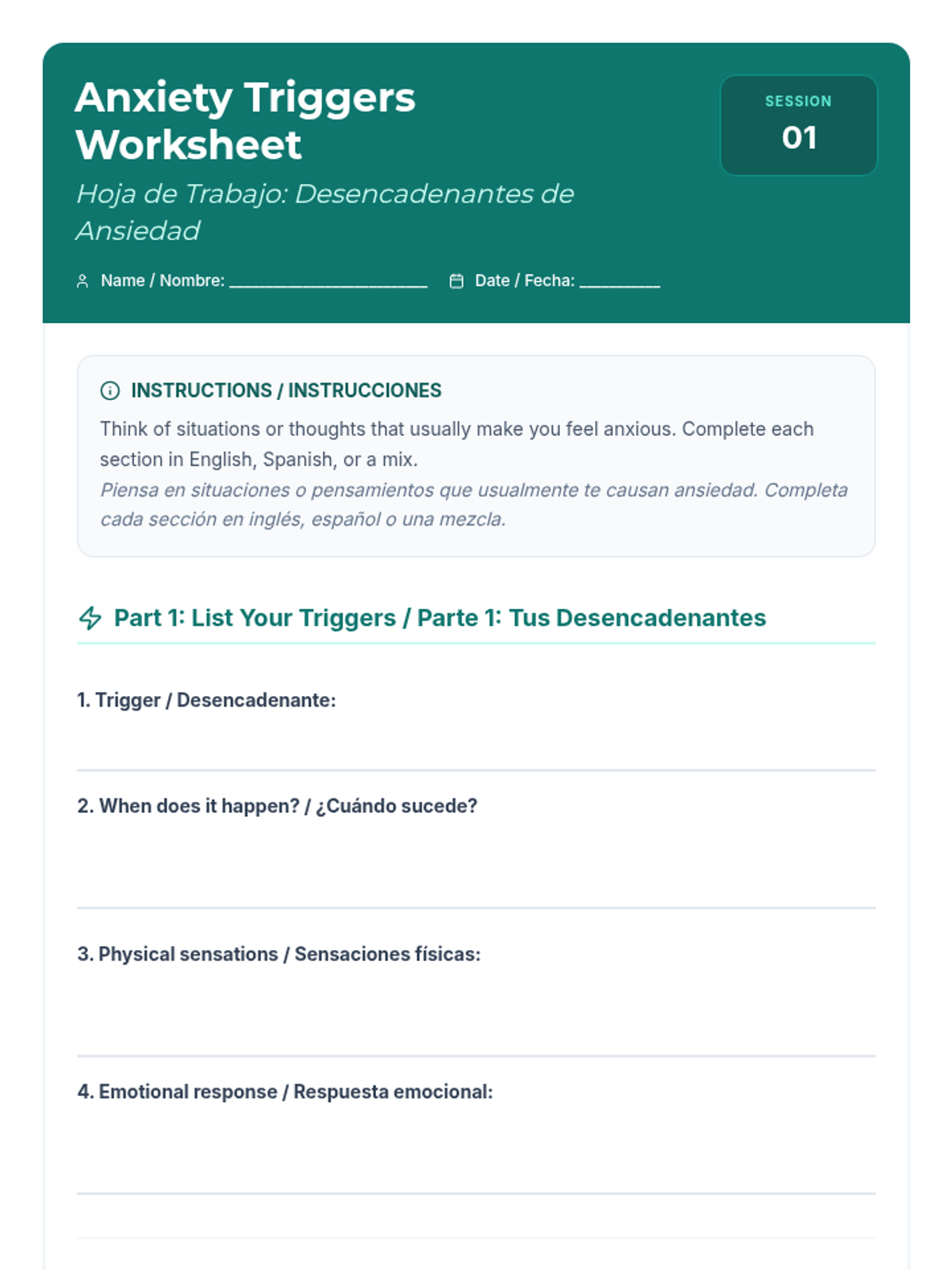 Recognizing Thinking PatternsIdentification of common cognitive distortions such as catastrophizing, overgeneralization, and emotional reasoning. Strengthens metacognitive awareness to disrupt negative internal monologues and promote balanced perspectives.