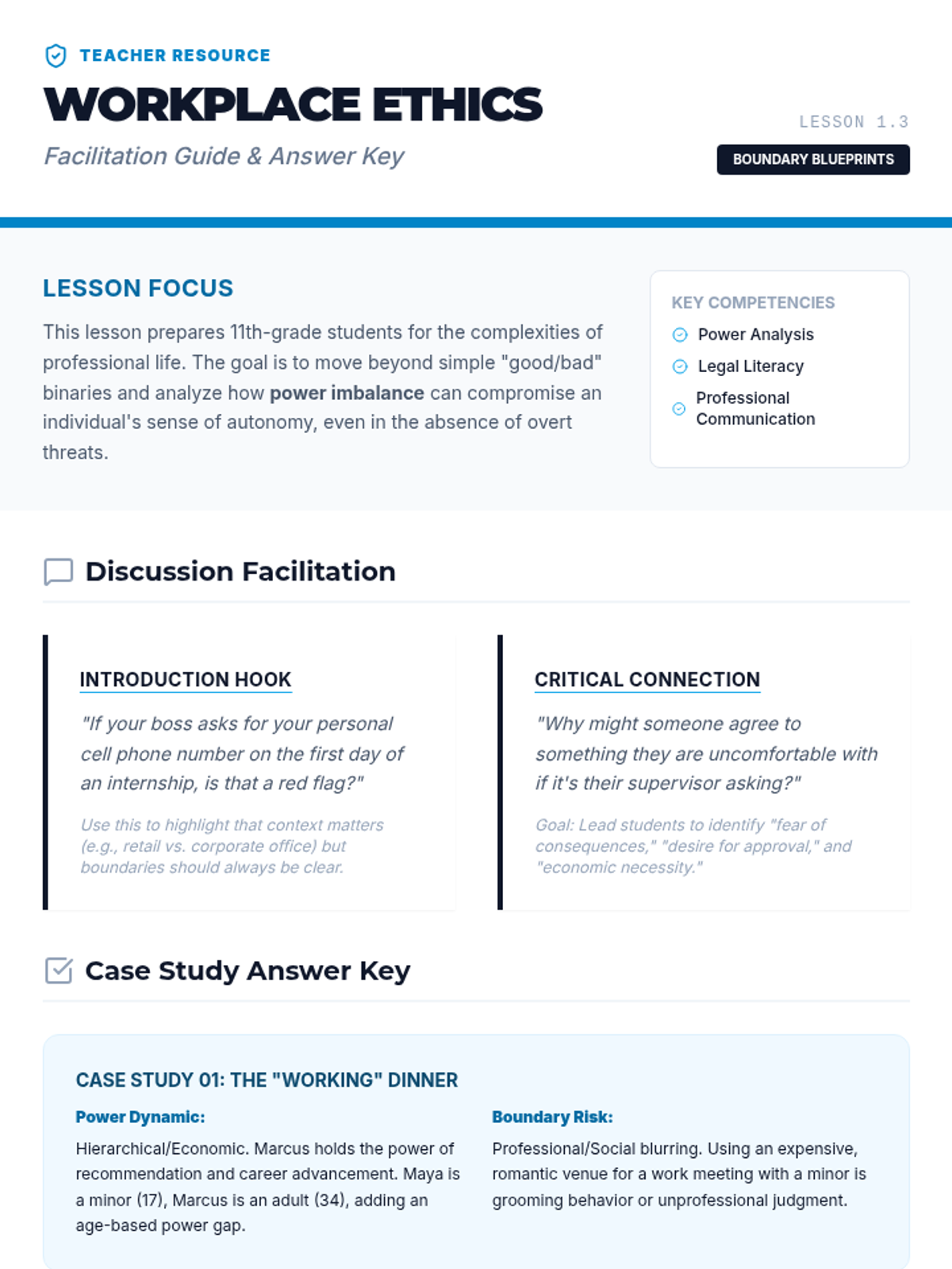 An analytical exploration of personal boundaries for 11th-grade students, focusing on power dynamics, digital ethics, legal consent, and cultural perspectives. Students develop a personal framework for navigating complex social and professional environments.